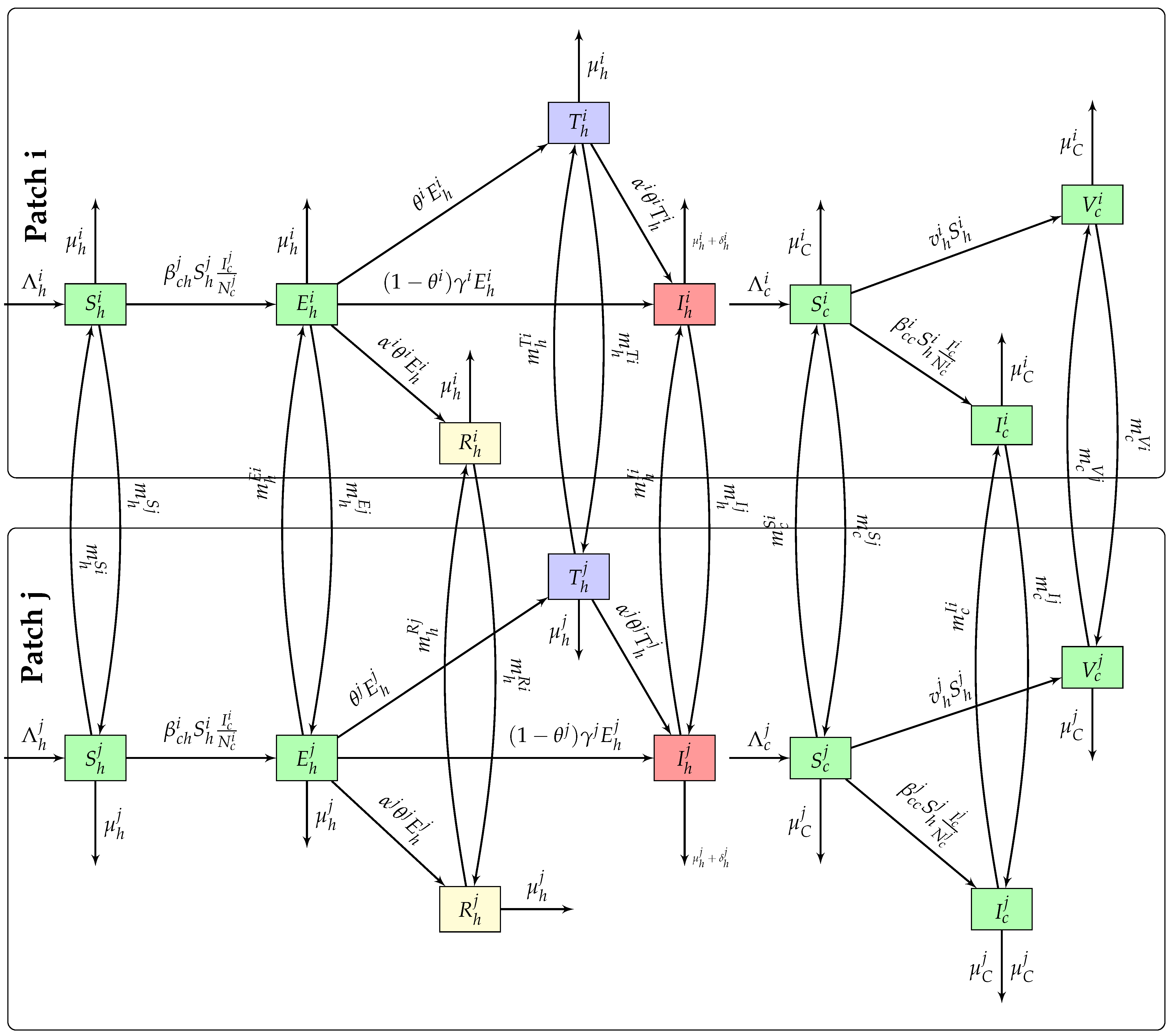 - Saad, A.A.; Arino, J.; Djomegni, P.M.T.; Haggar, M.S.D. A metapopulation model for the spread of cholera. arXiv 2025, arXiv:2505.17269. [Google Scholar] [CrossRef]
