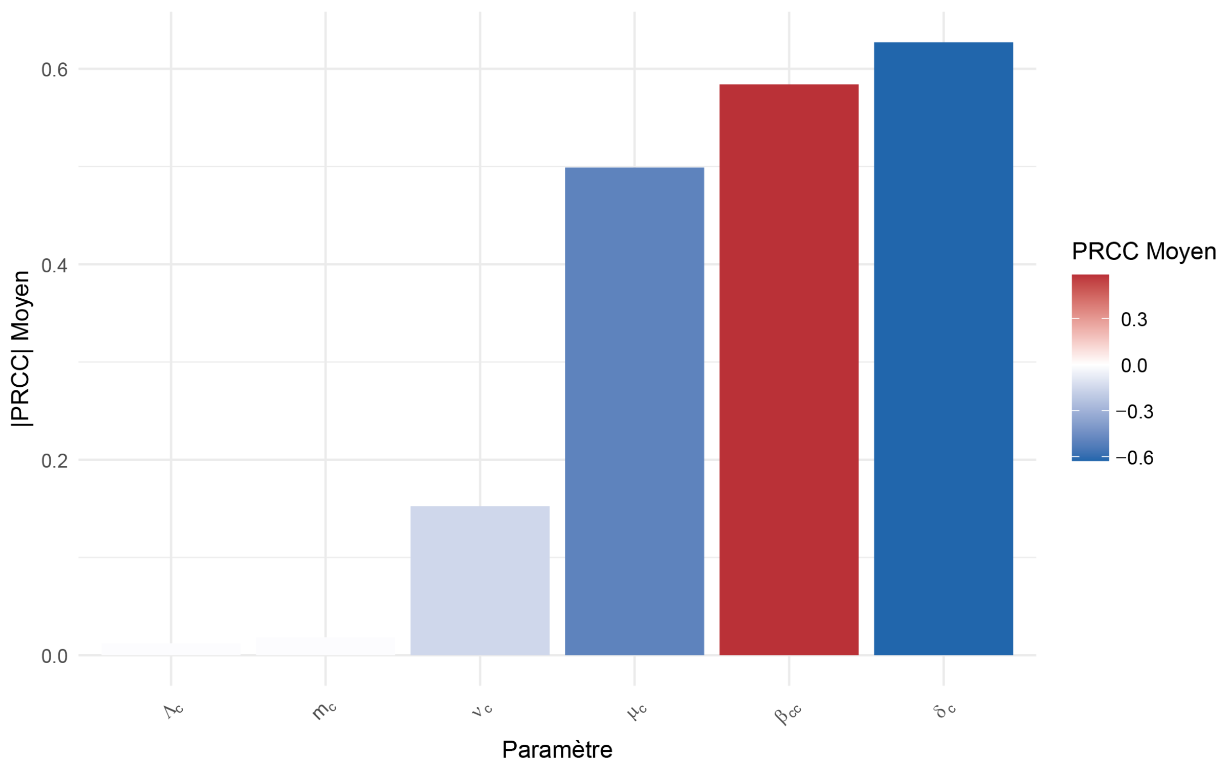 Figure 2) represent priority targets for reduction measures (e.g., decreasing transmission rates). Parameters with high negative PRCC represent intervention opportunities (e.g., increasing vaccination or treatment rates).