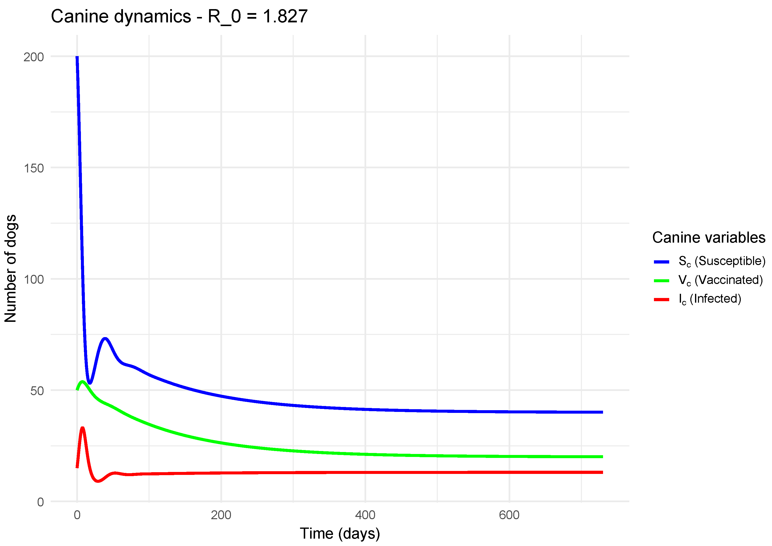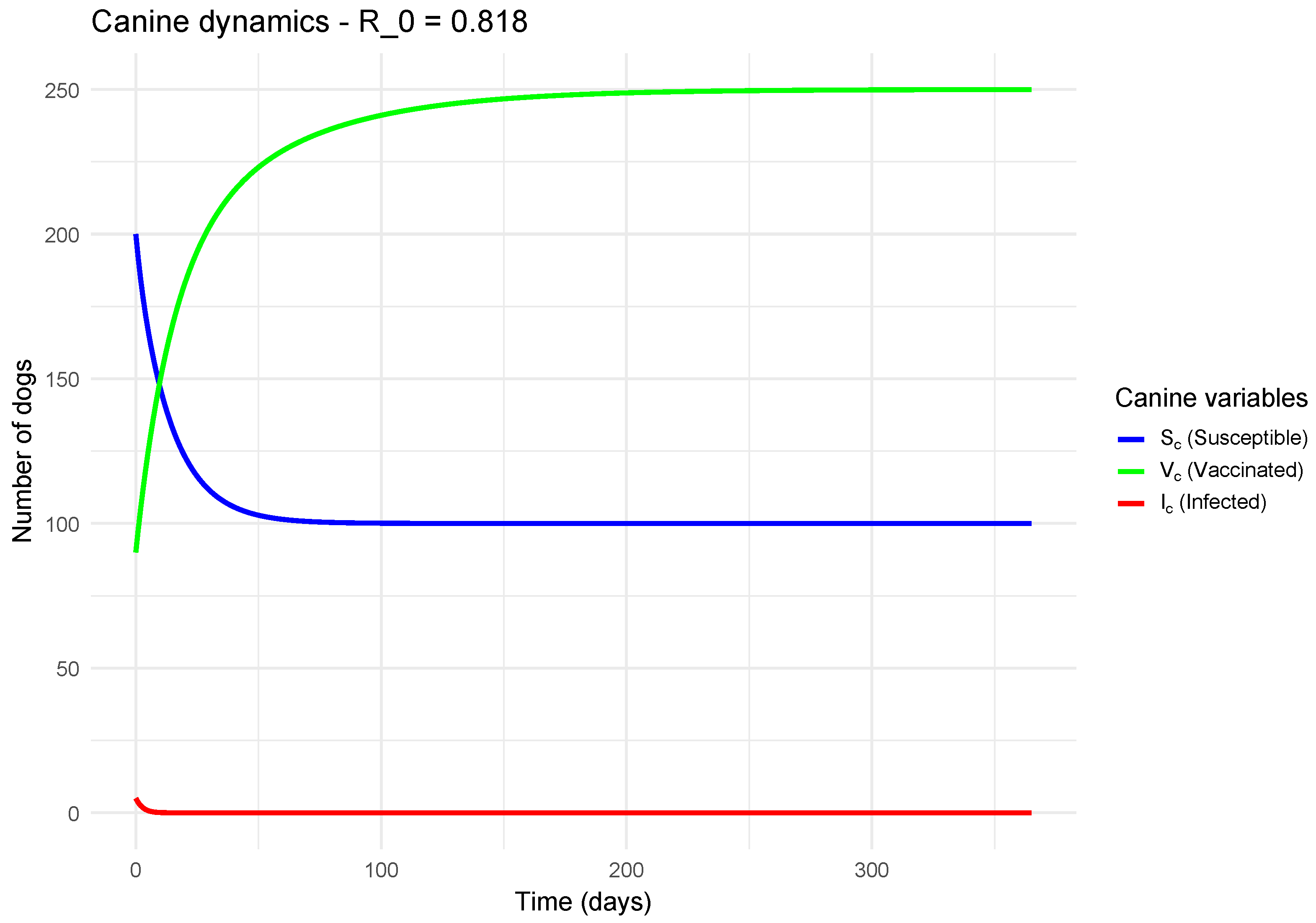These results highlight the critical relationship between disease control in the animal reservoir (the dog) and the risk to human health. They emphasize the importance of maintaining sufficient canine vaccination coverage to ensure that remains sustainably below 1, in order to prevent both canine epidemics and human rabies cases.