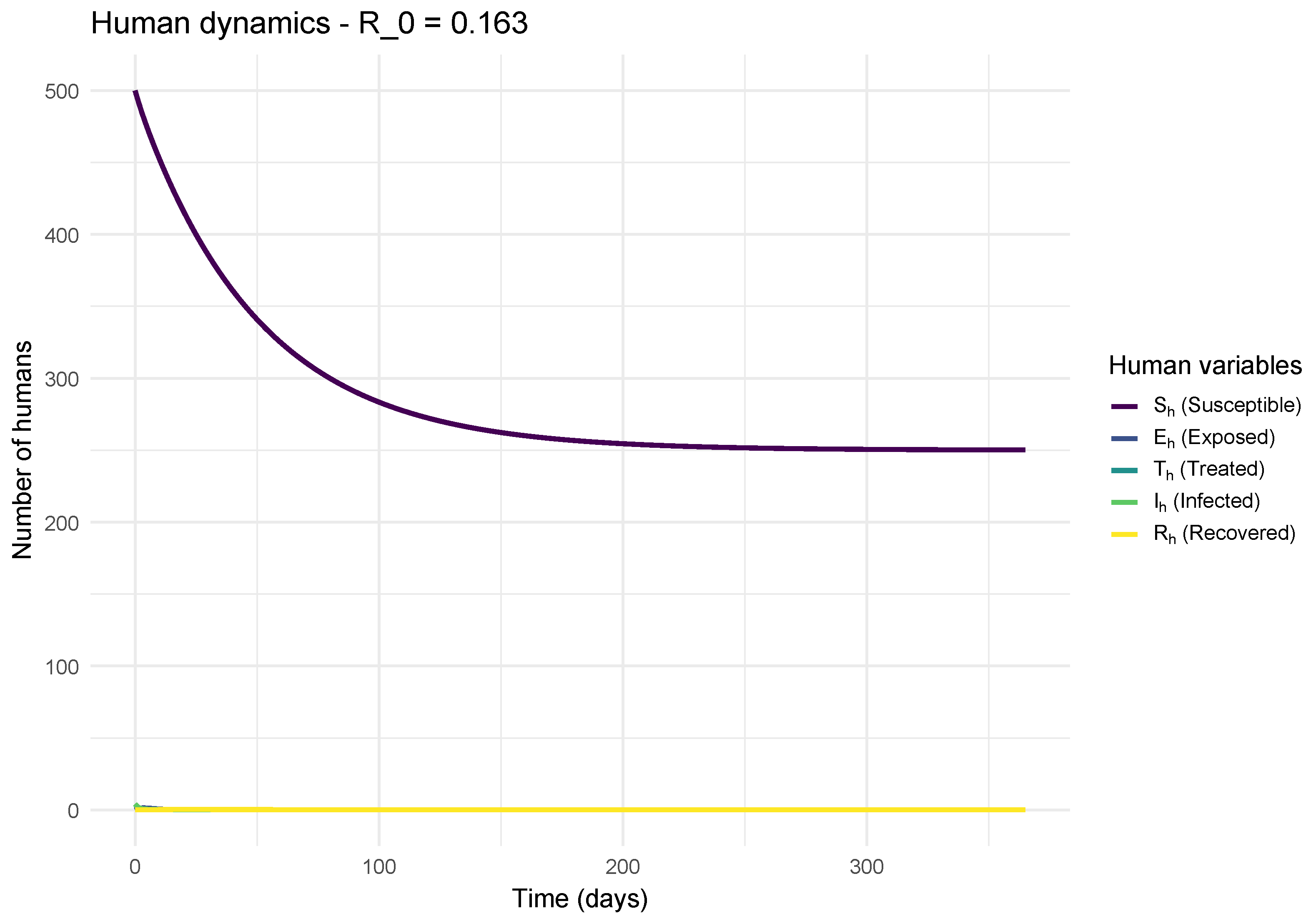 . The curves of the exposed, infected, and treated compartments remain consistently at negligible, if not zero, levels. The human population remains mostly, if not entirely, in the susceptible (