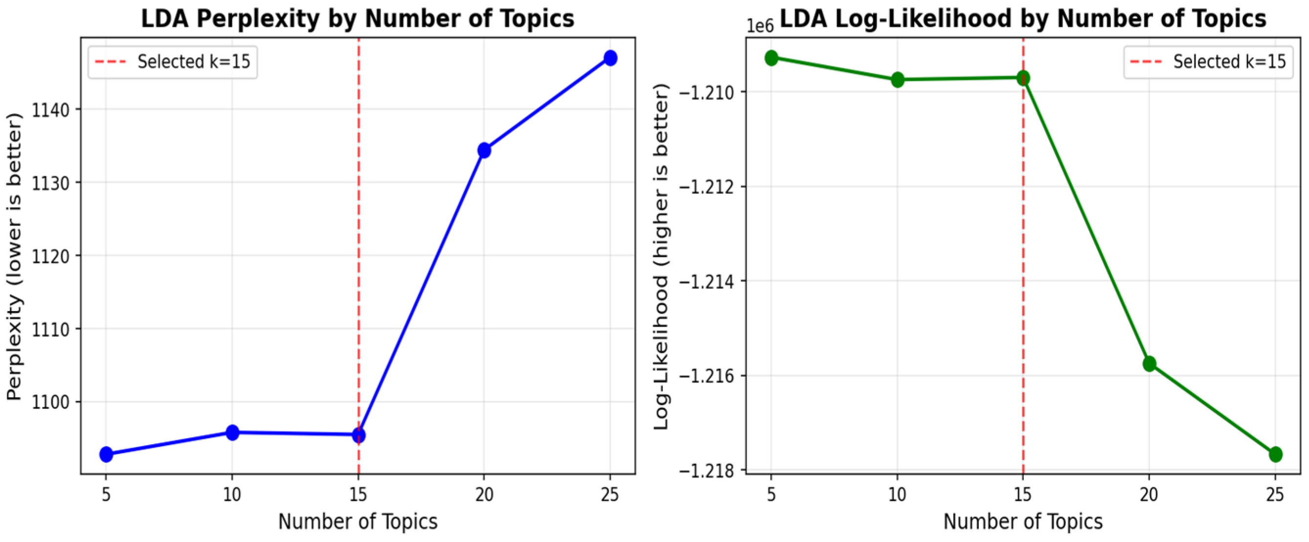 LDA model selection: perplexity and log-likelihood by number of topics.