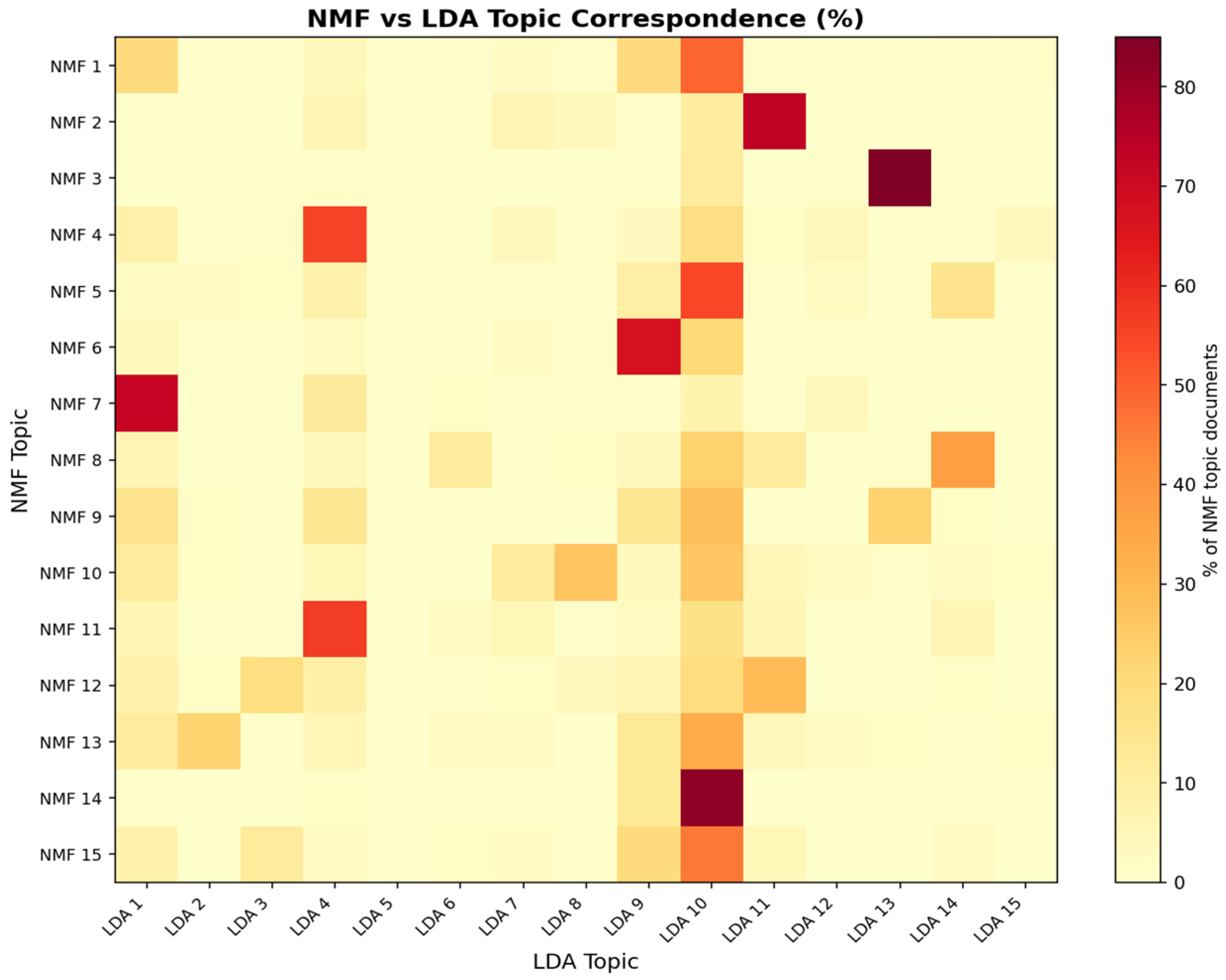 | BERTopic ↔ NMF | 96.4% | Strongest |