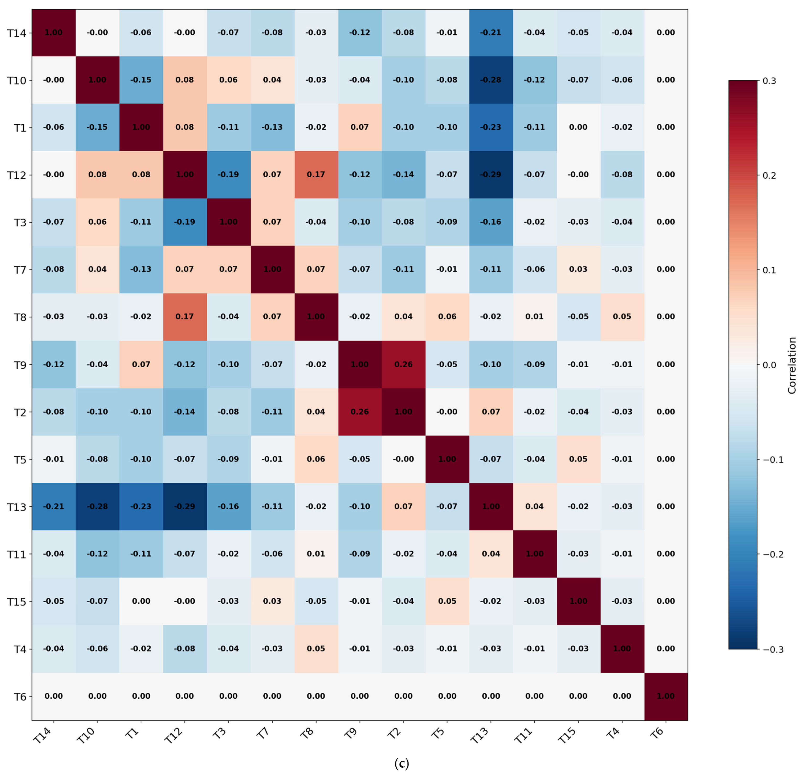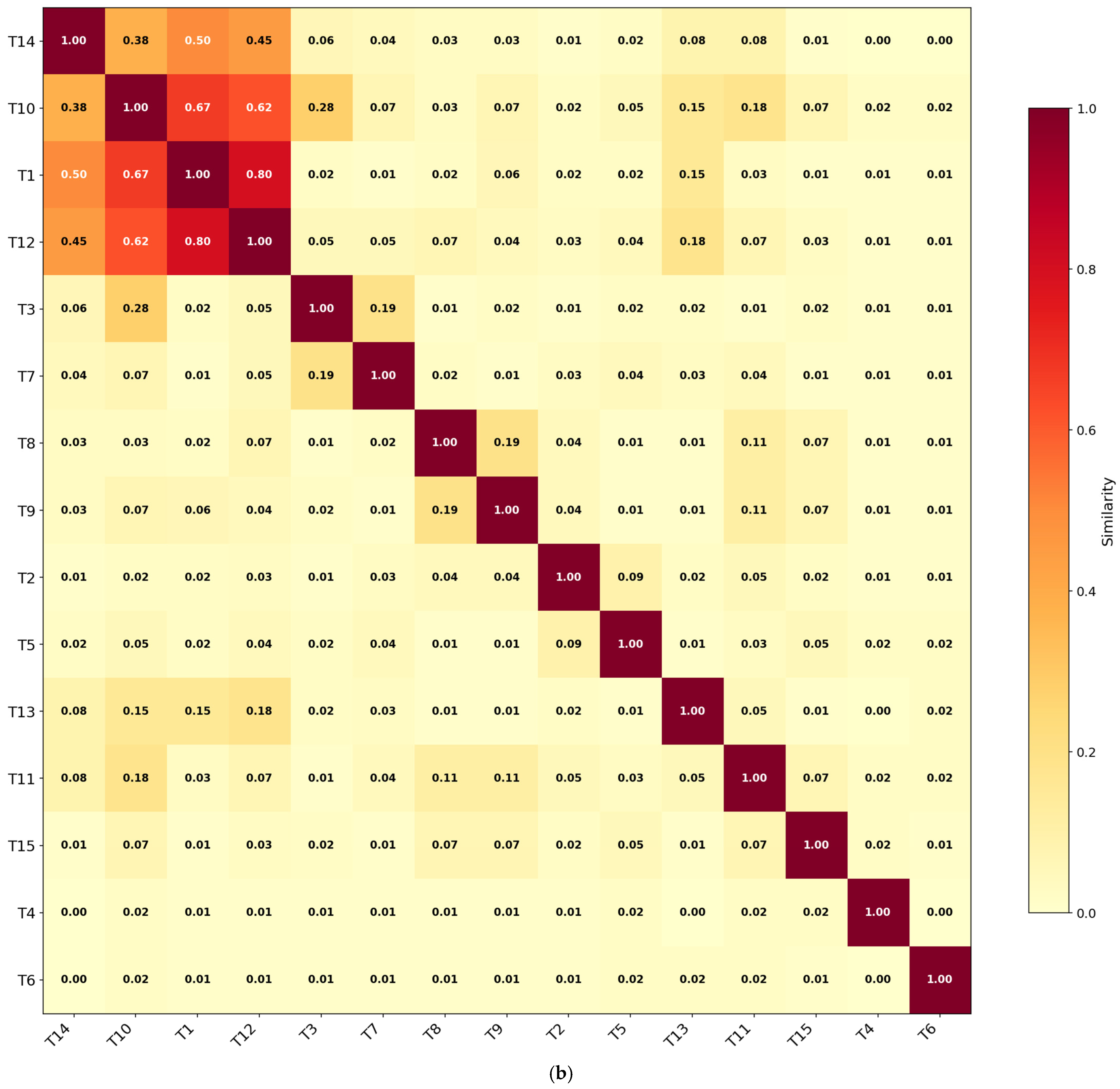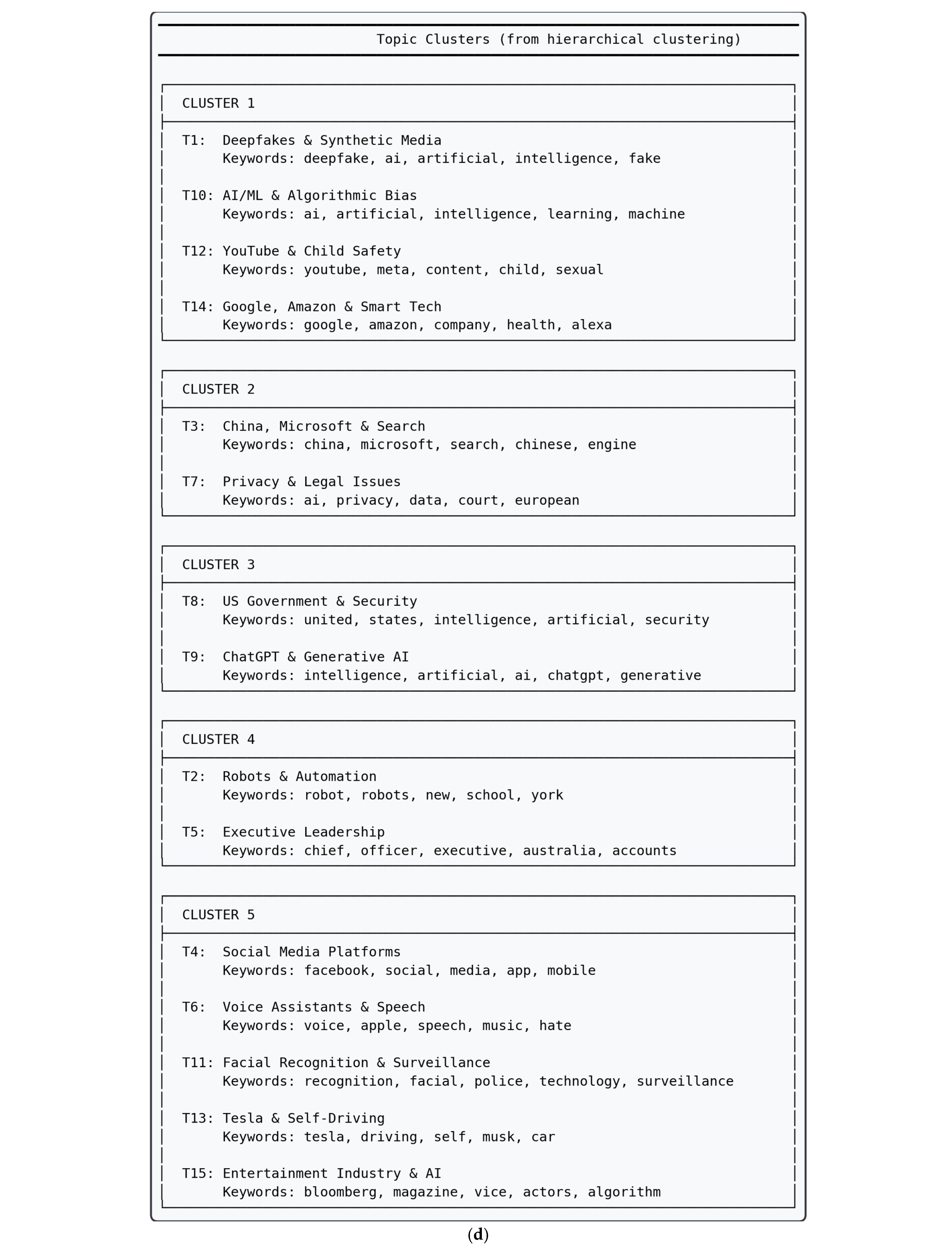 (a). Hierarchical clustering dendrogram. (b). Topic similarity matrix. (c). Topic co-occurrence correlation matrix. (d). Identified topic clusters.