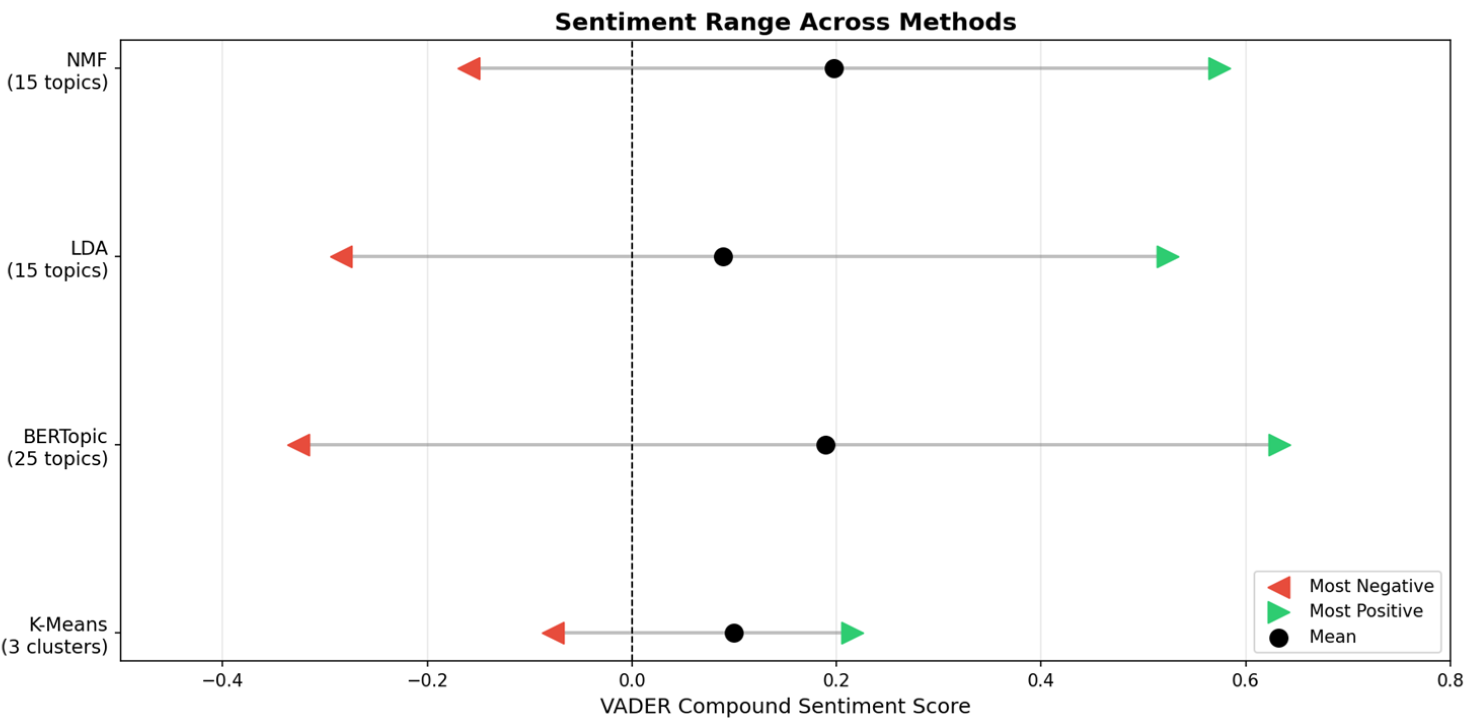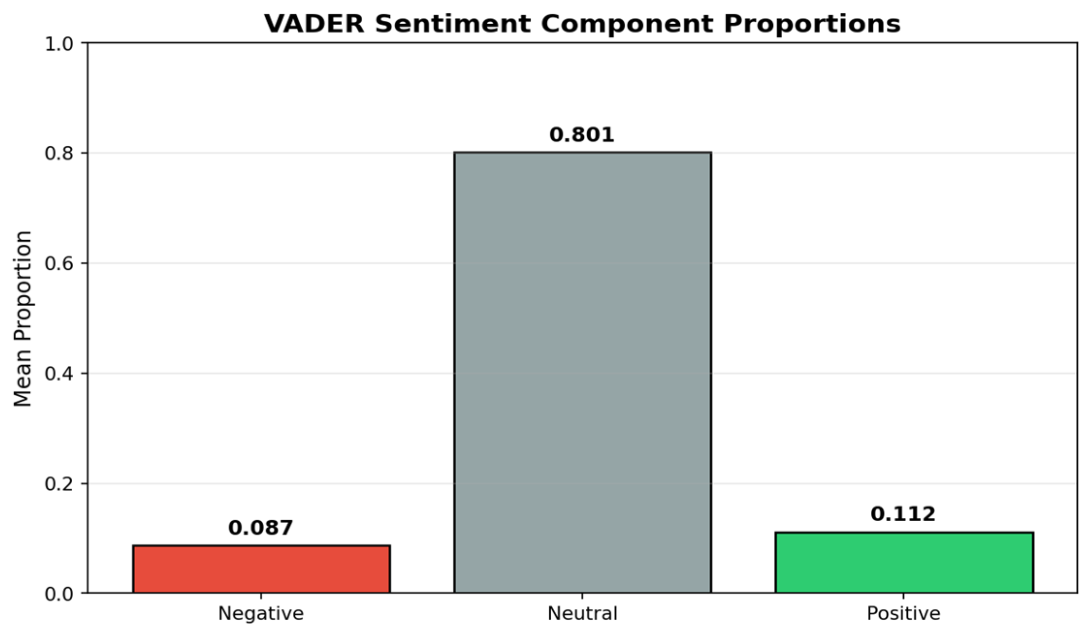 | VADER Sentiment | Emotional framing | Valence scores (−1 to +1) |