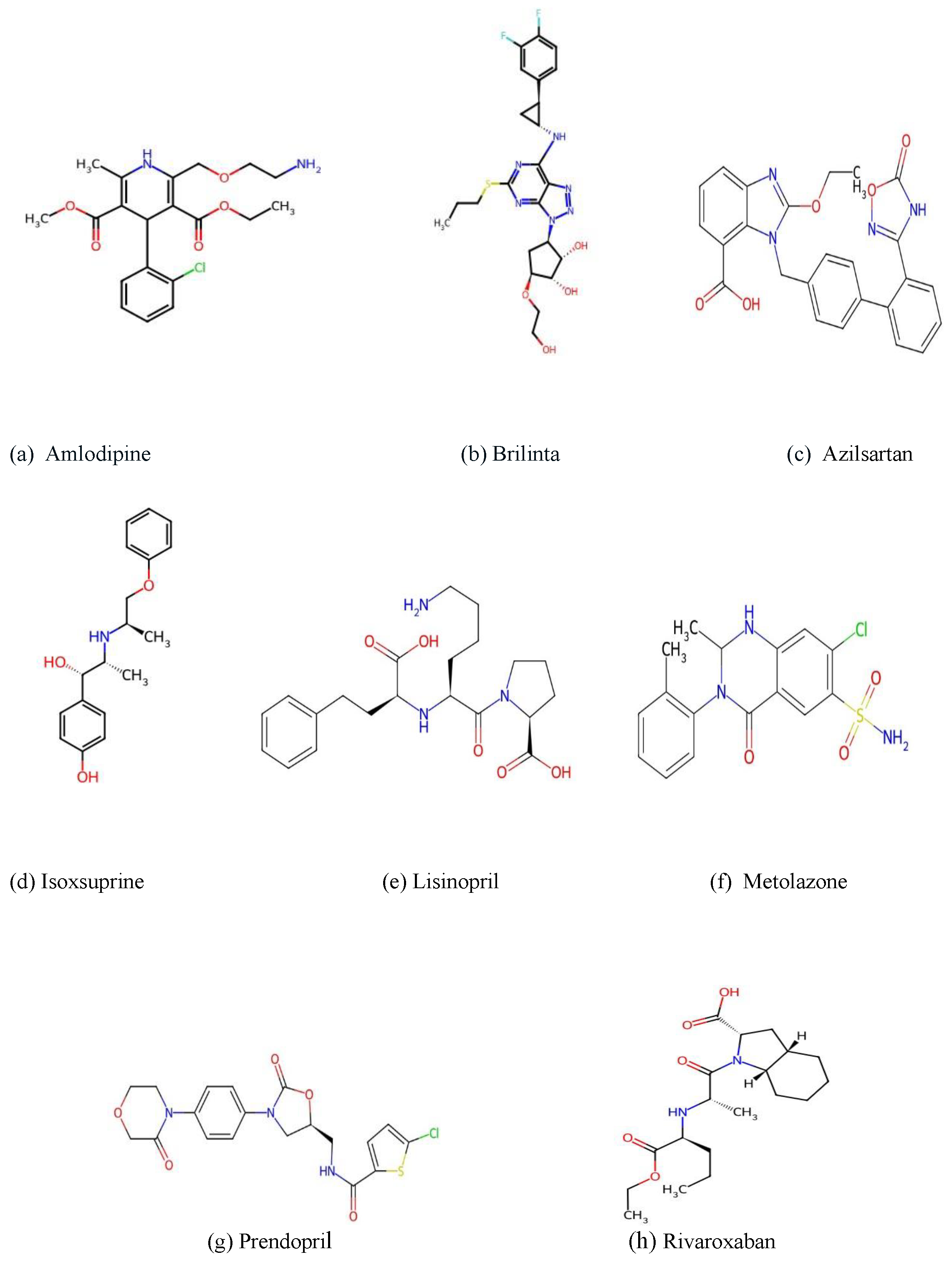 Molecular structures of drugs for coronary artery disease treatment: Brilinta, Amlodipine, Xarelto, Brilinta, Perindopril, Isoxsuprine, Azilsartan, and Metolazone.