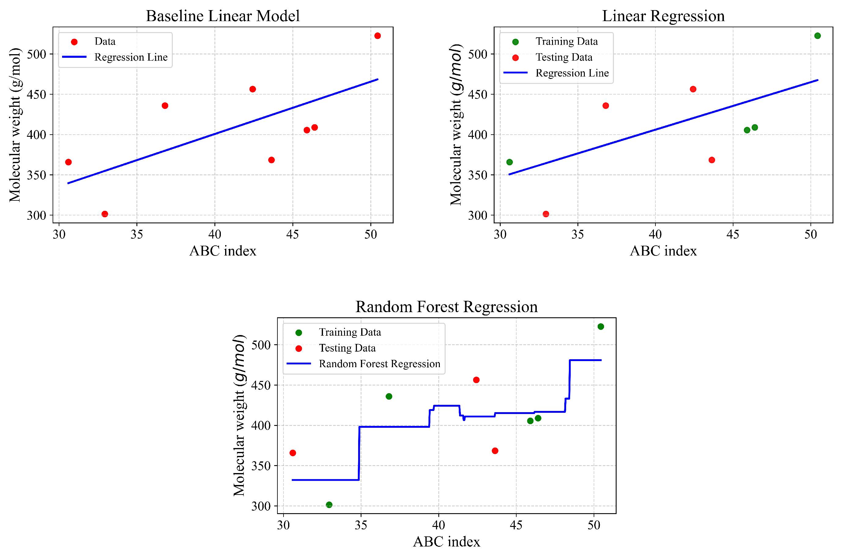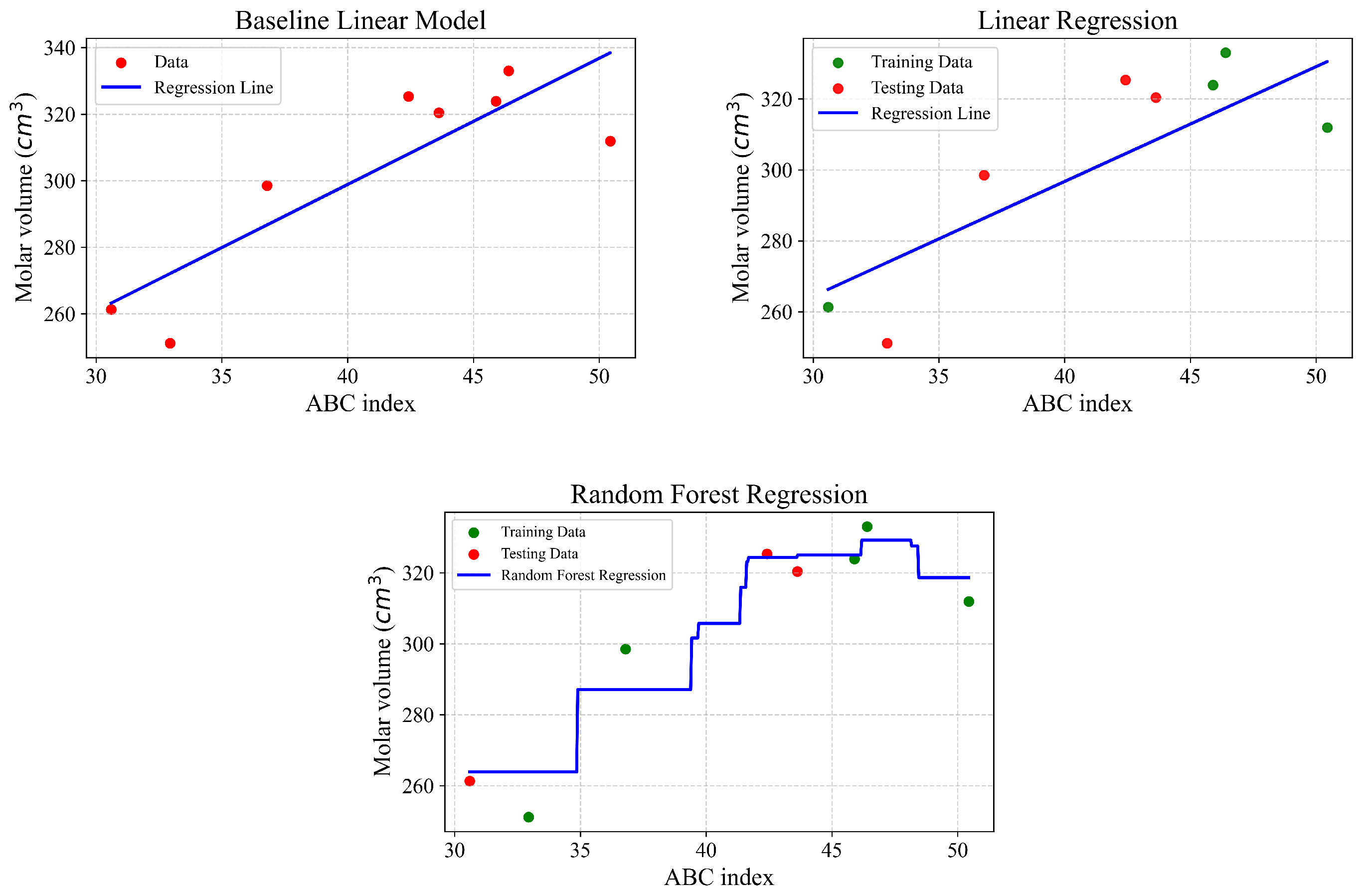 Comparison of regression models for the ABC index. Each subplot represents the predicted and observed relationships obtained from baseline linear model, linear regression, and random forest models.
