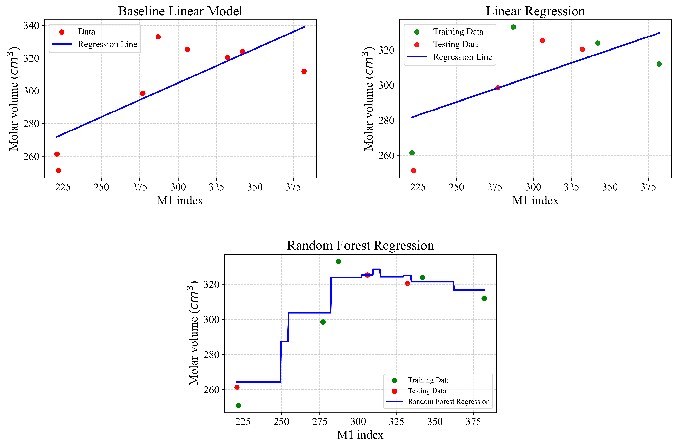 Comparison of regression models for the M1 index. Each subplot represents the predicted and observed relationships obtained from baseline linear model, linear regression, and random forest models.