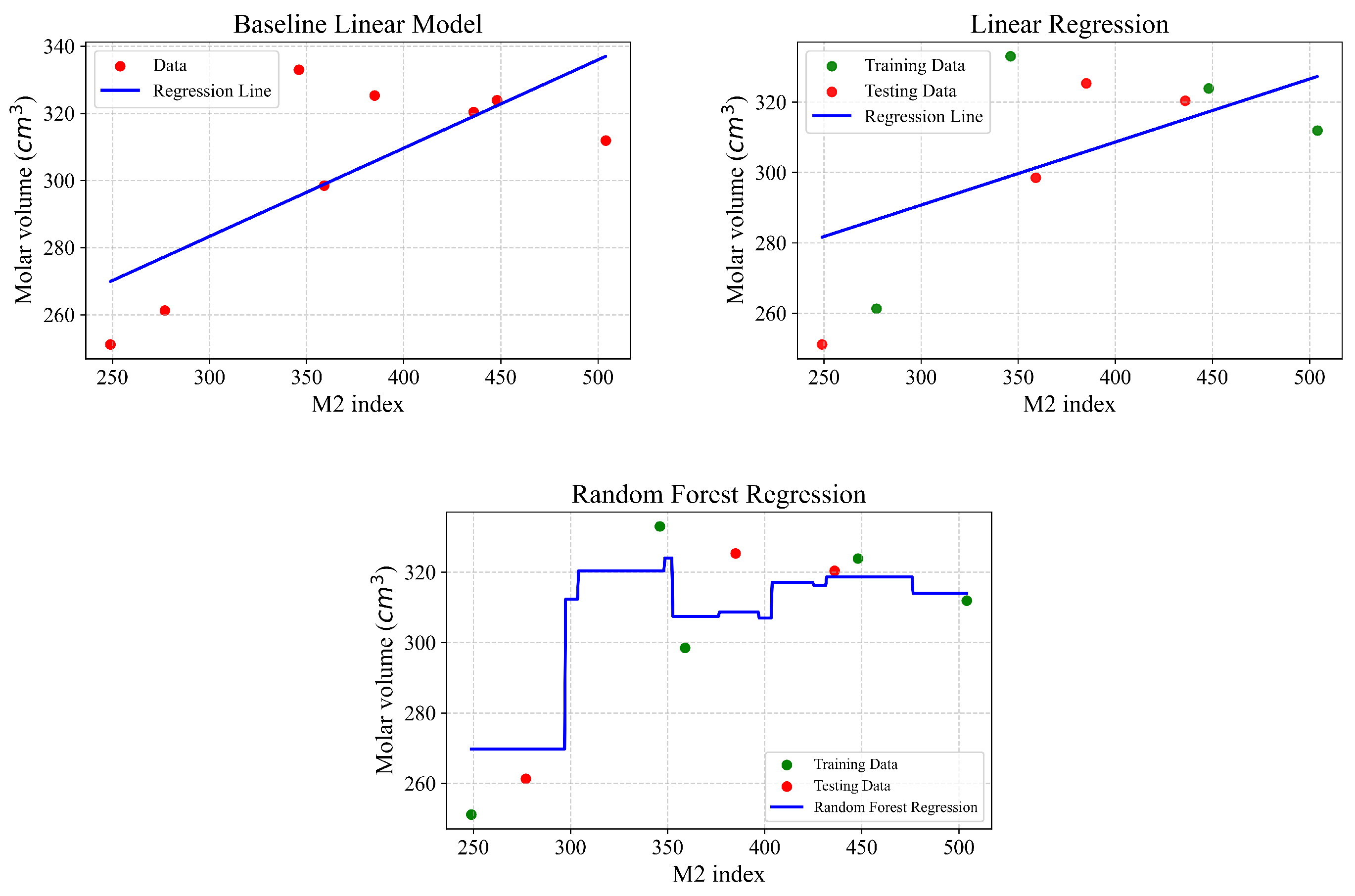 Comparison of regression models for the M2 index. Each subplot represents the predicted and observed relationships obtained from baseline linear model, linear regression, and random forest models.