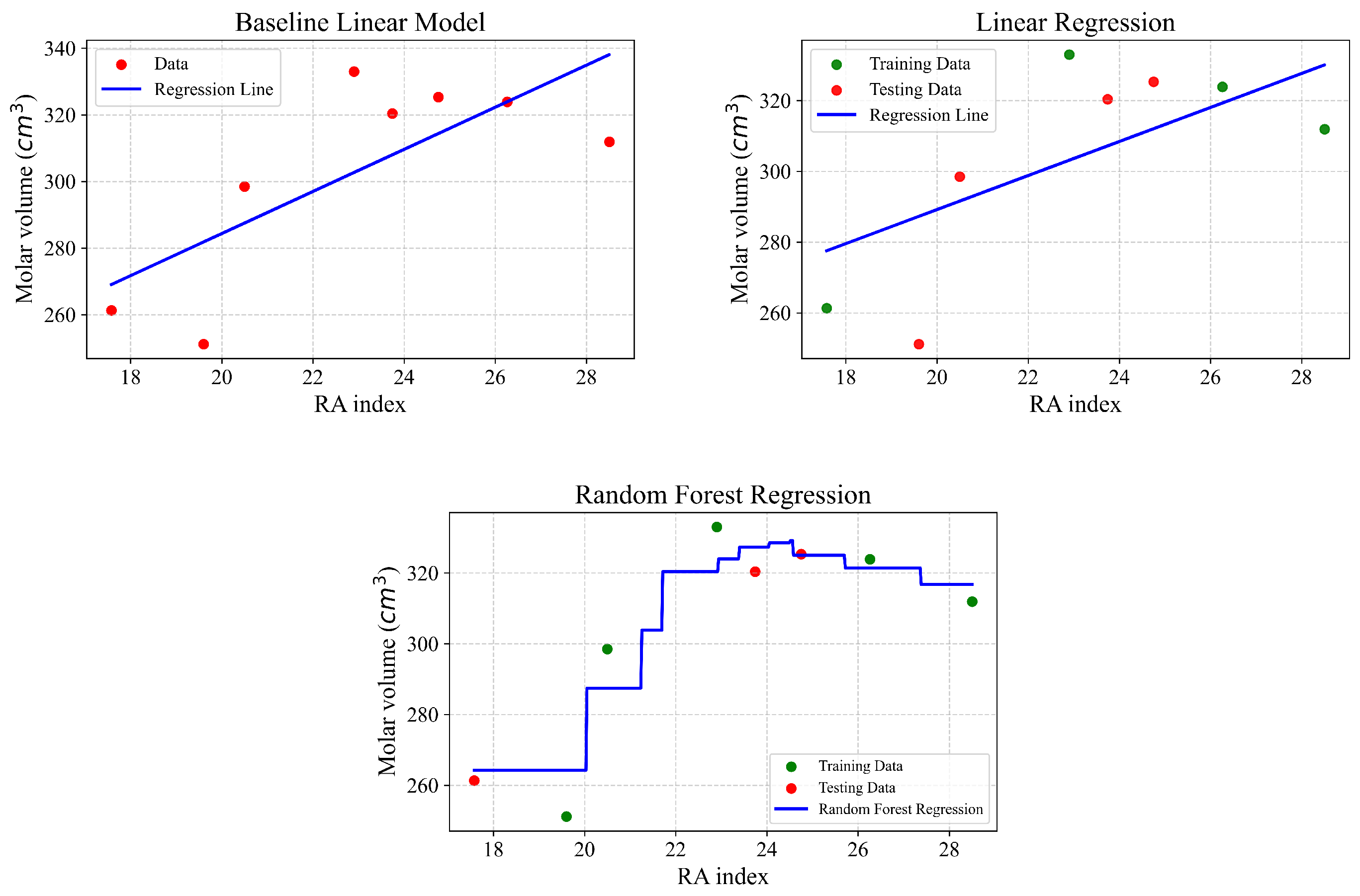 Random Forest (RF): The Random Forest algorithm is employed as a more flexible nonlinear model capable of capturing intricate interactions among structural descriptors. RF constructs an ensemble of decision trees, each trained on bootstrapped subsets of the data and descriptor space, thereby reducing variance and mitigating overfitting [