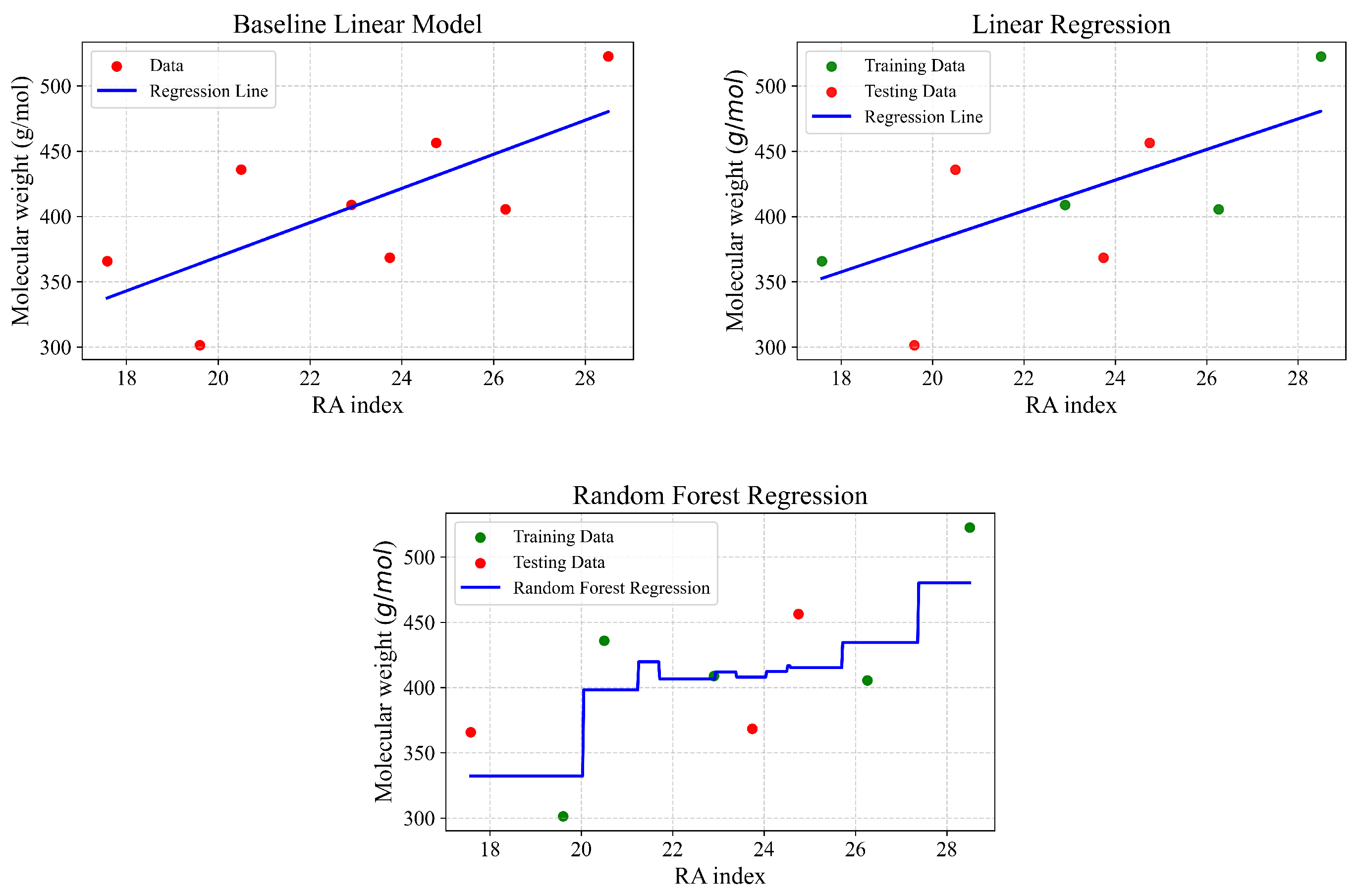Comparison of regression models for the RA index. Each subplot represents the predicted and observed relationships obtained from baseline linear model, linear regression, and random forest models.