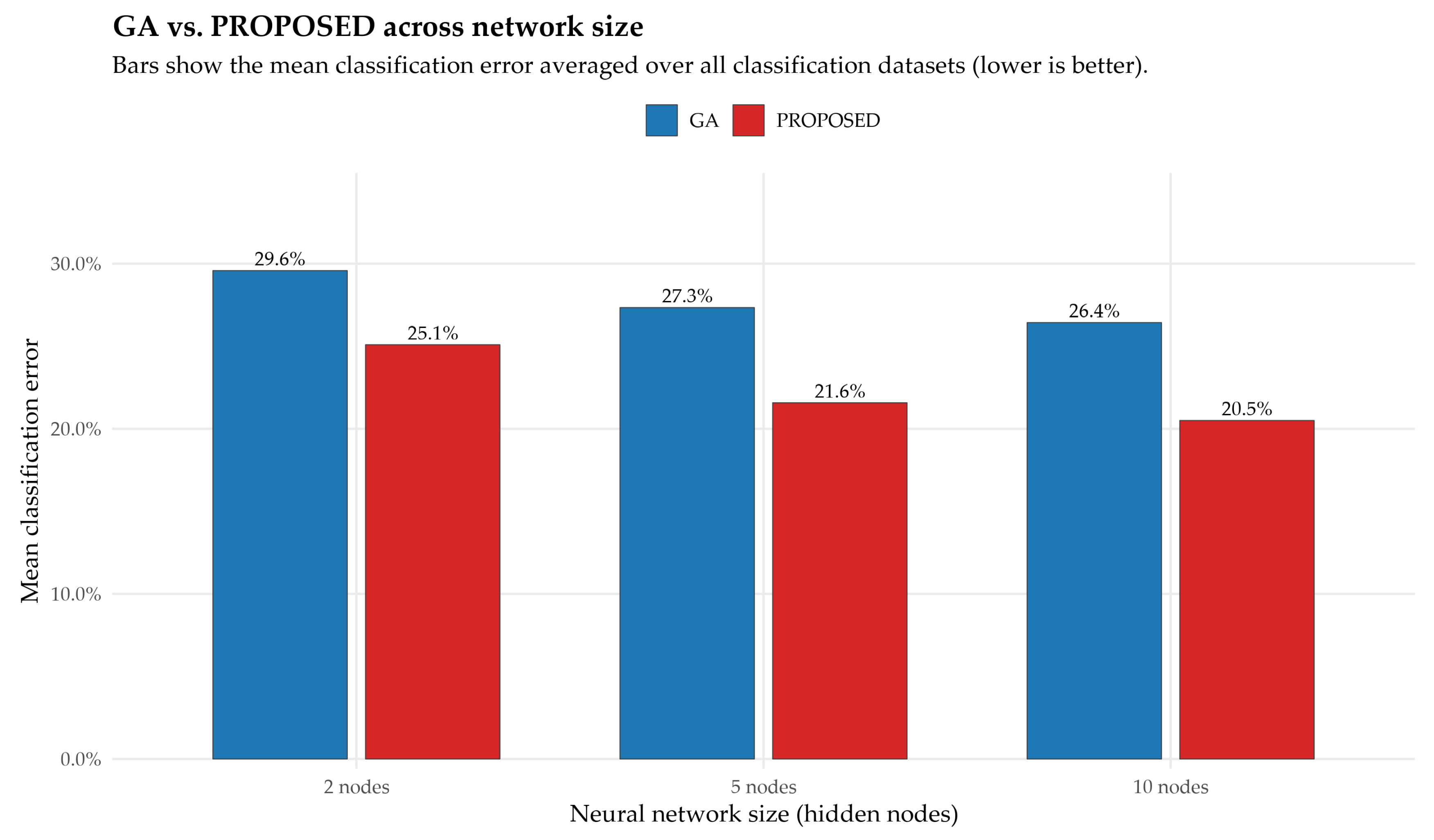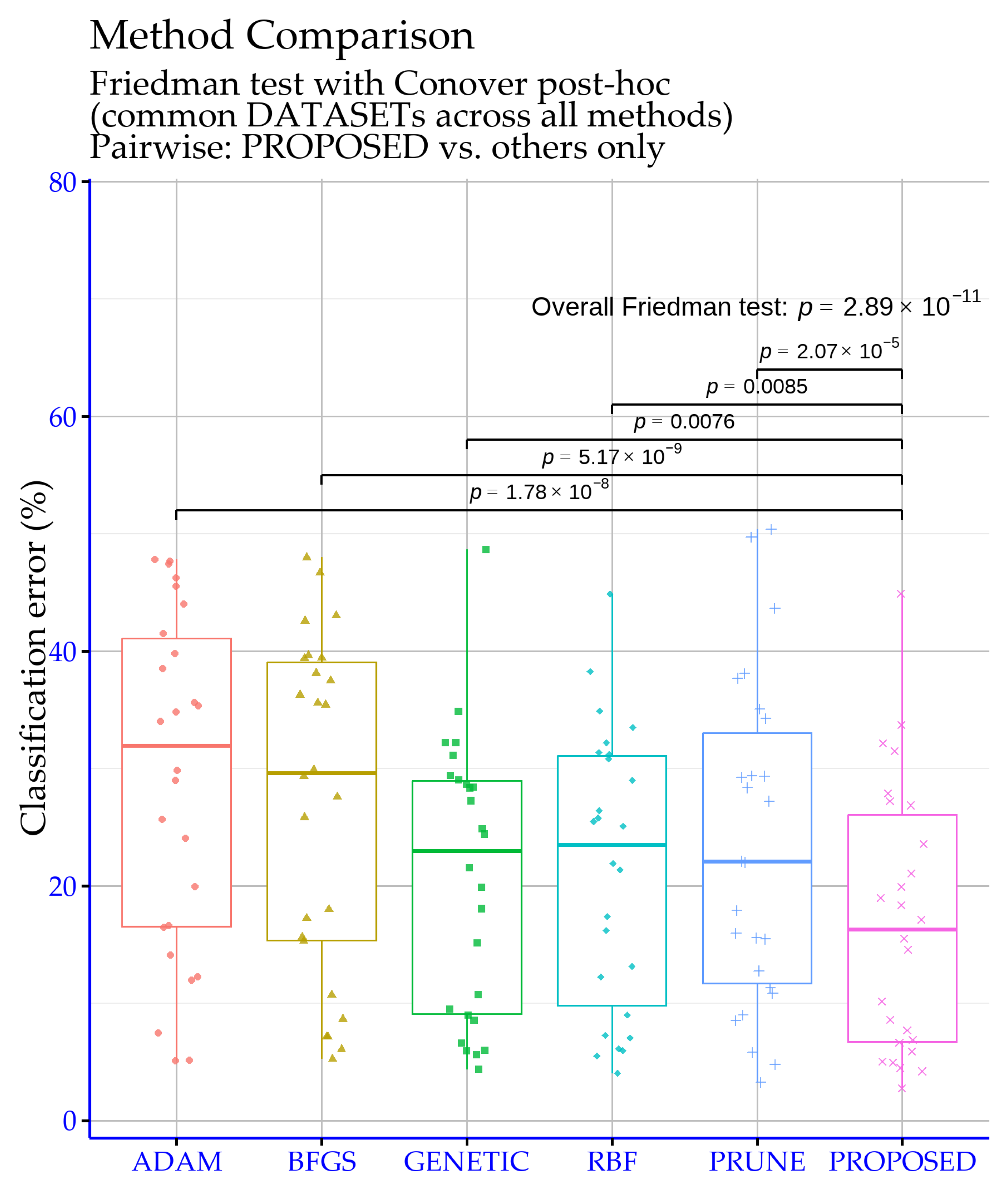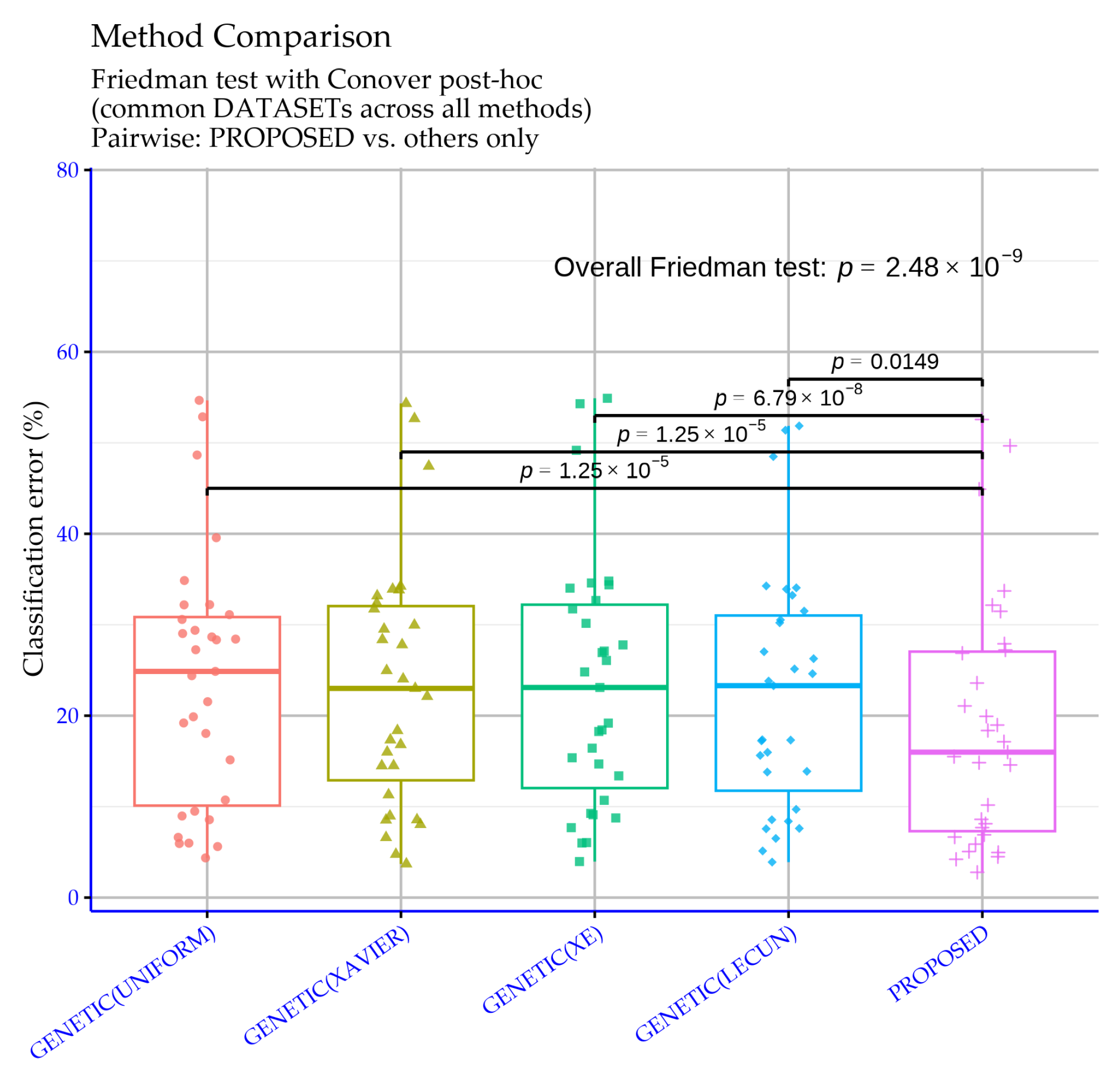 Figure 12 confirms that the proposed method’s advantage over the genetic variants is not only reflected in mean error rates, but is also statistically substantiated across the full set of classification experiments.