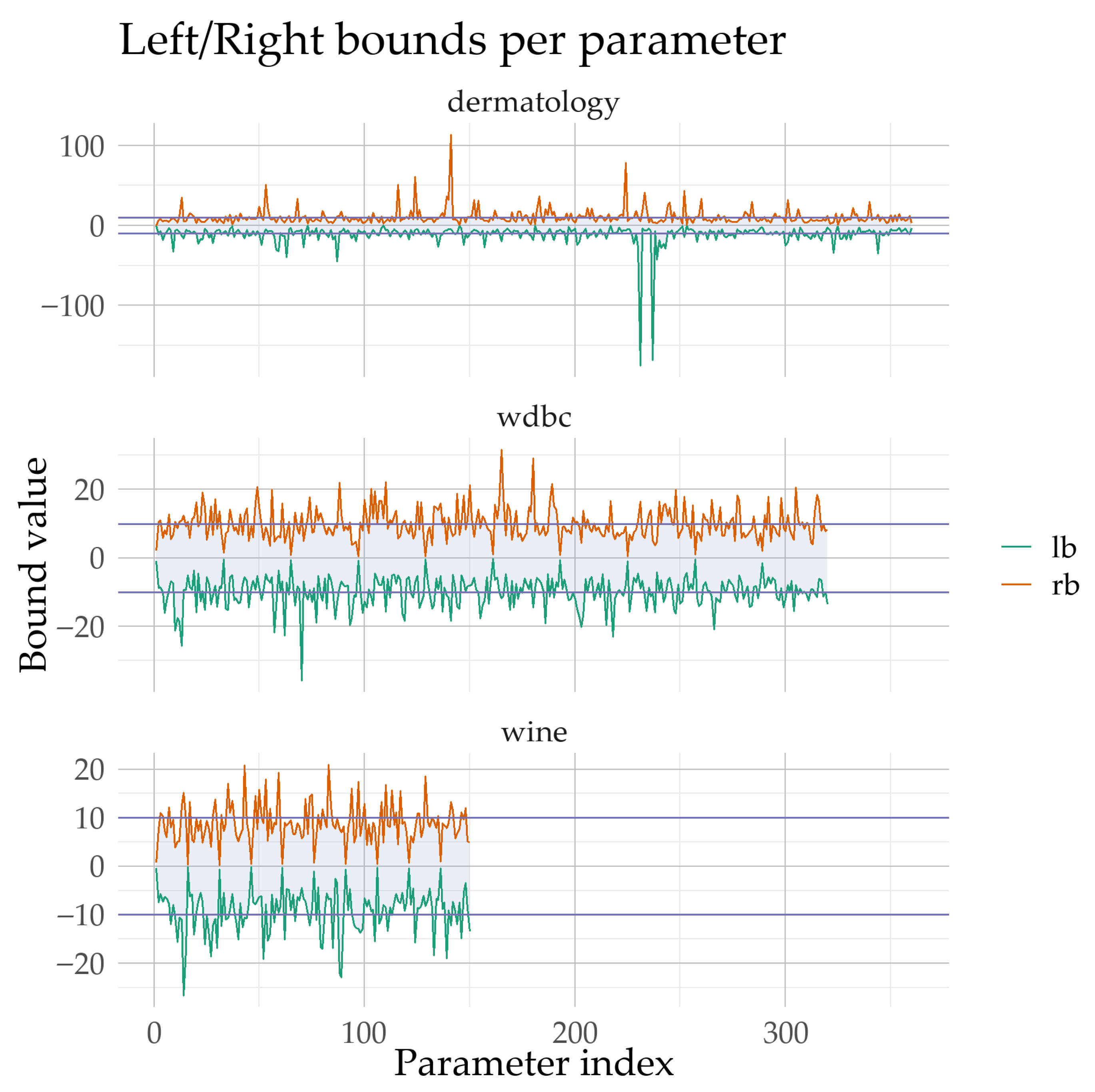 Figure 4, the computed parameter intervals of the neural network are reported as left and right bounds (L and R) obtained by the Simulated Annealing bound-optimization stage for three datasets with different dimensionalities (WINE: 150 parameters, WDBC: 320, DERMATOLOGY: 360). The visualization highlights that the bounds do not change uniformly; instead, they vary substantially across parameters and across datasets, indicating that the proposed stage does not enforce a fixed range but identifies problem-dependent search regions. Most intervals cross zero and remain centered close to 0, while their widths can become very large and exhibit occasional extreme expansions, particularly for DERMATOLOGY where a subset of parameters attains markedly wider intervals. As shown in