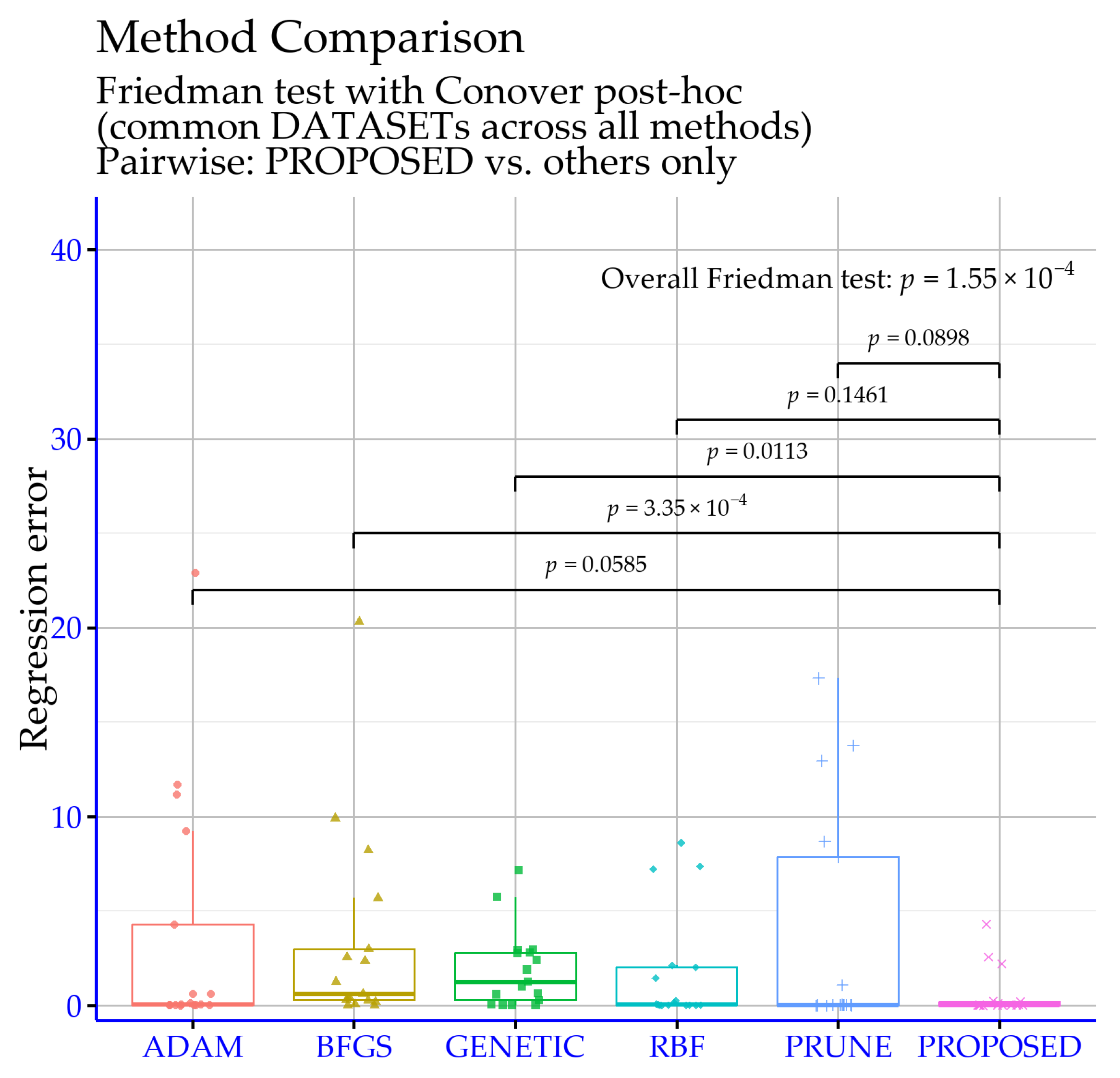 The pairwise outcomes reveal a more mixed pattern than in the classification case, which is expected in regression settings where absolute error scales can vary substantially across datasets. The strongest evidence of a difference in favor of the proposed approach is observed against BFGS (