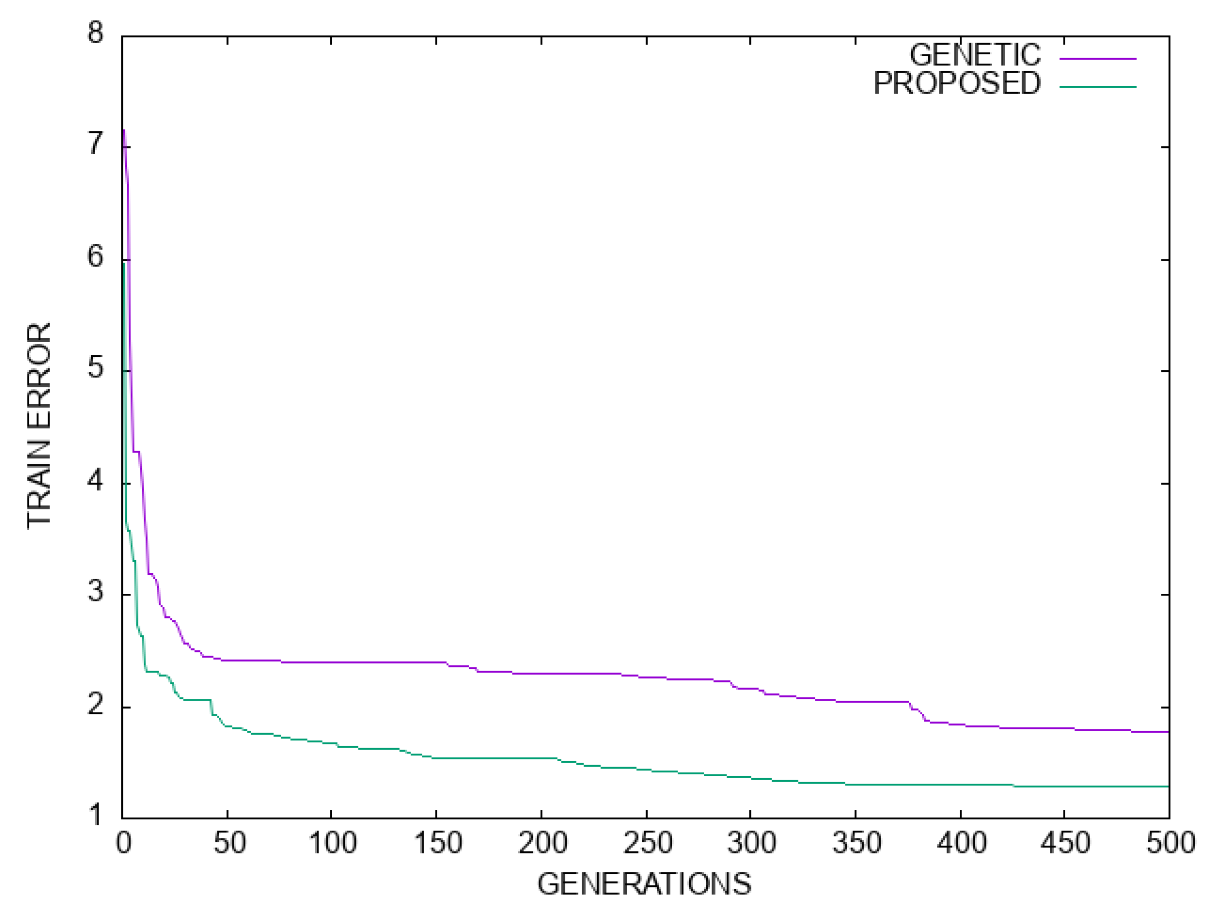 Figure 6, an indicative plot is presented for the comparison of the training process between the Genetic Algorithm and the proposed method for the regression dataset MORTGAGE.