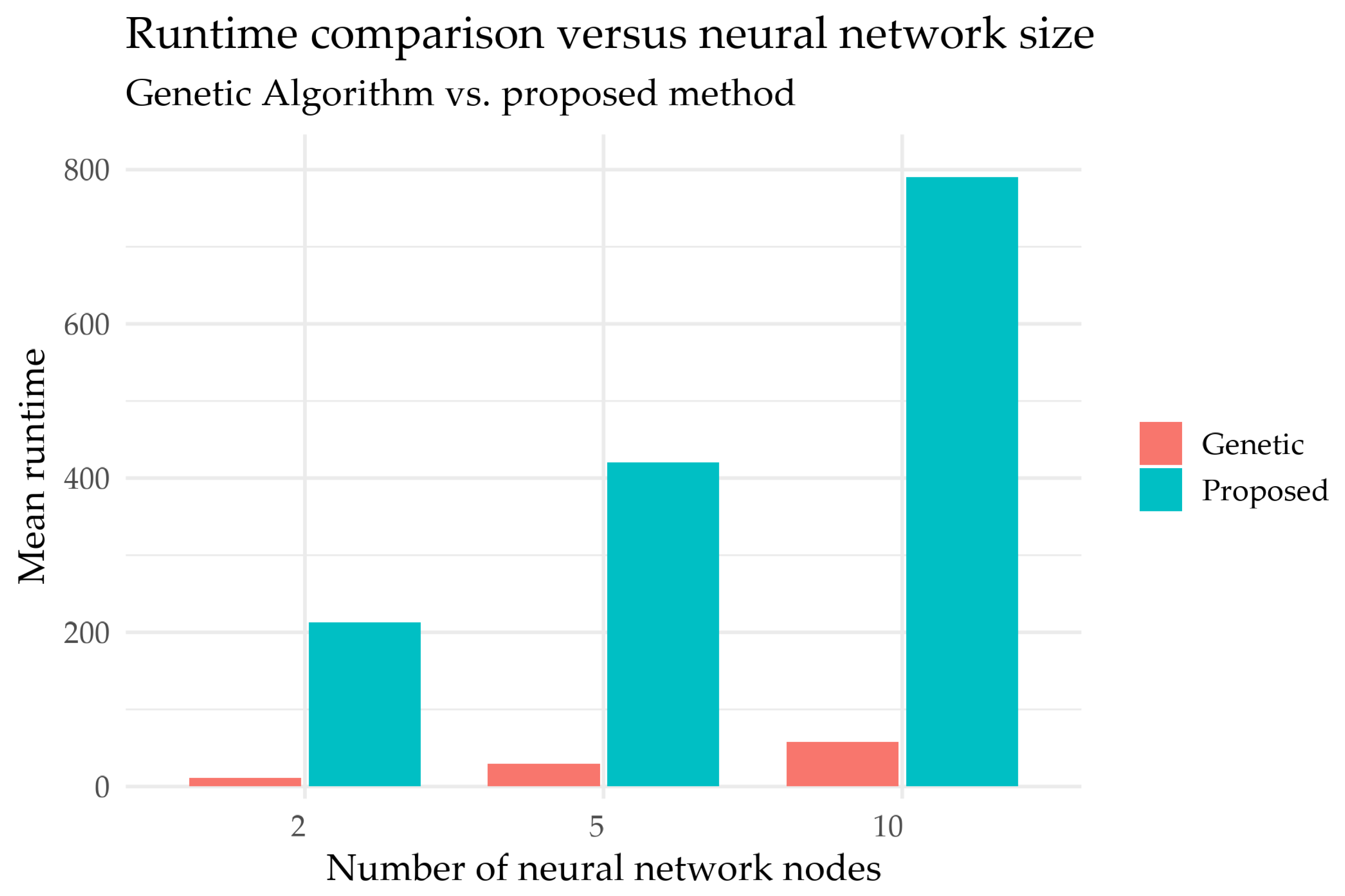 Figure 7 reports mean runtime as a function of the neural network’s number of nodes, comparing the Genetic Algorithm against the proposed method. Both runtimes increase with network size, but the proposed method consistently exhibits a much higher computational cost. Specifically, for two nodes, the Genetic Algorithm requires 11.34 on average versus 213.21 for the proposed method; for five nodes, the corresponding values are 29.18 versus 420.43; and for 10 nodes, they are 57.95 versus 790.35. The gap remains large in all cases, and the relative overhead decreases only slightly as network size grows, without changing the overall conclusion. Overall, the results document a clear trade-off: the proposed method is substantially more time-consuming, and its use is therefore justified when improvements in accuracy or generalization outweigh the additional computational burden.