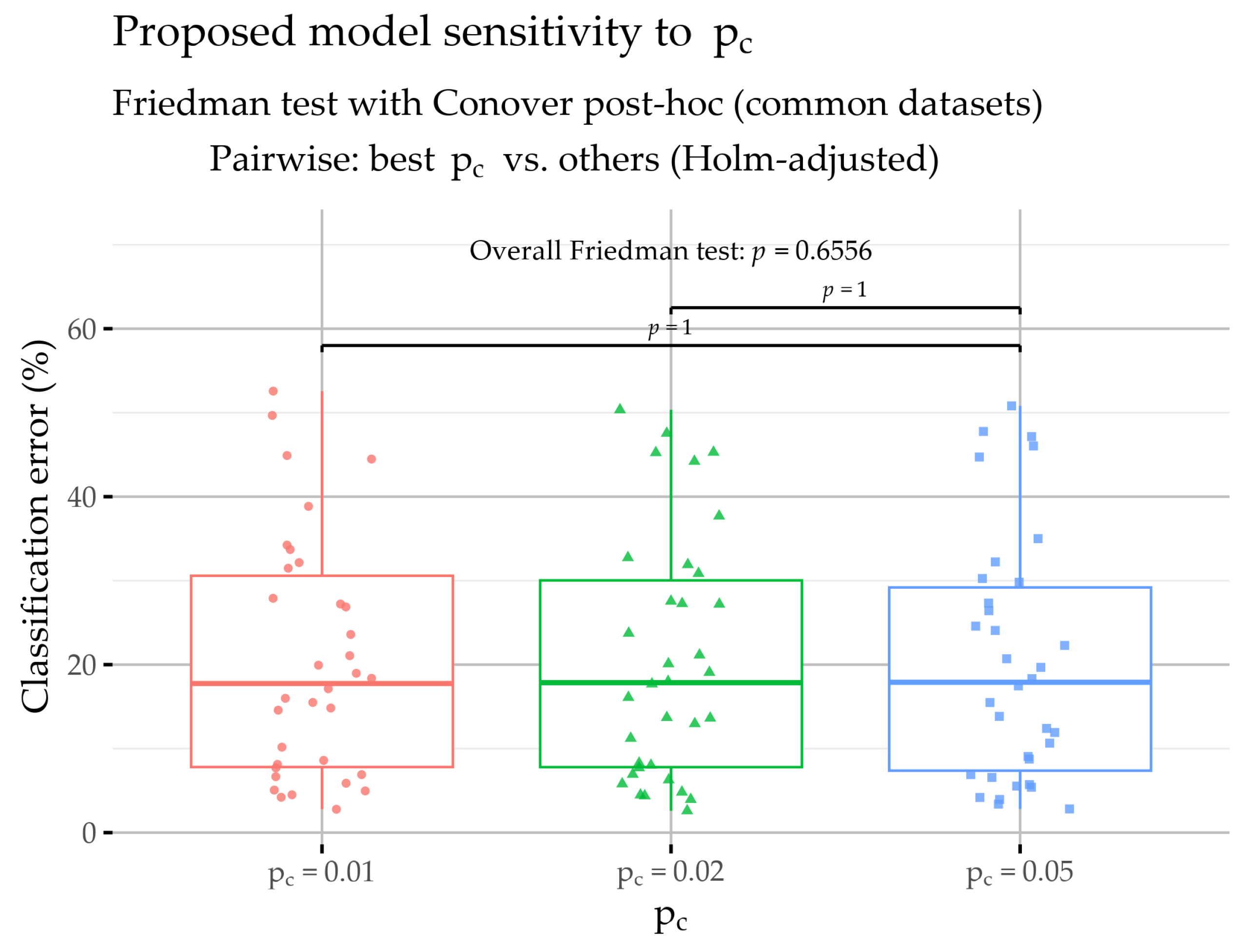 Figure 8 indicates that varying the pc parameter does not produce statistically detectable differences in the proposed model’s performance on the classification datasets. The overall Friedman test yields