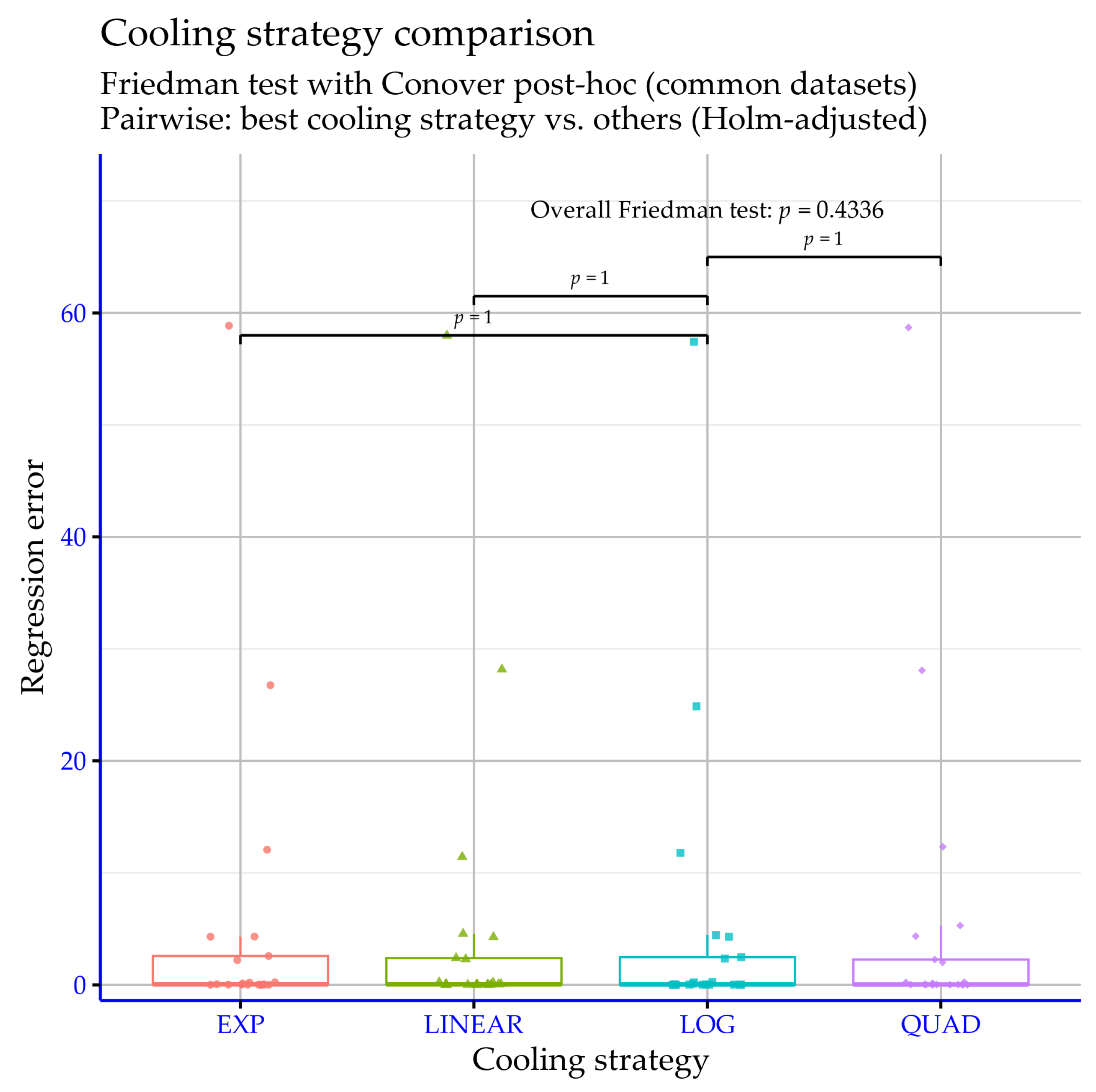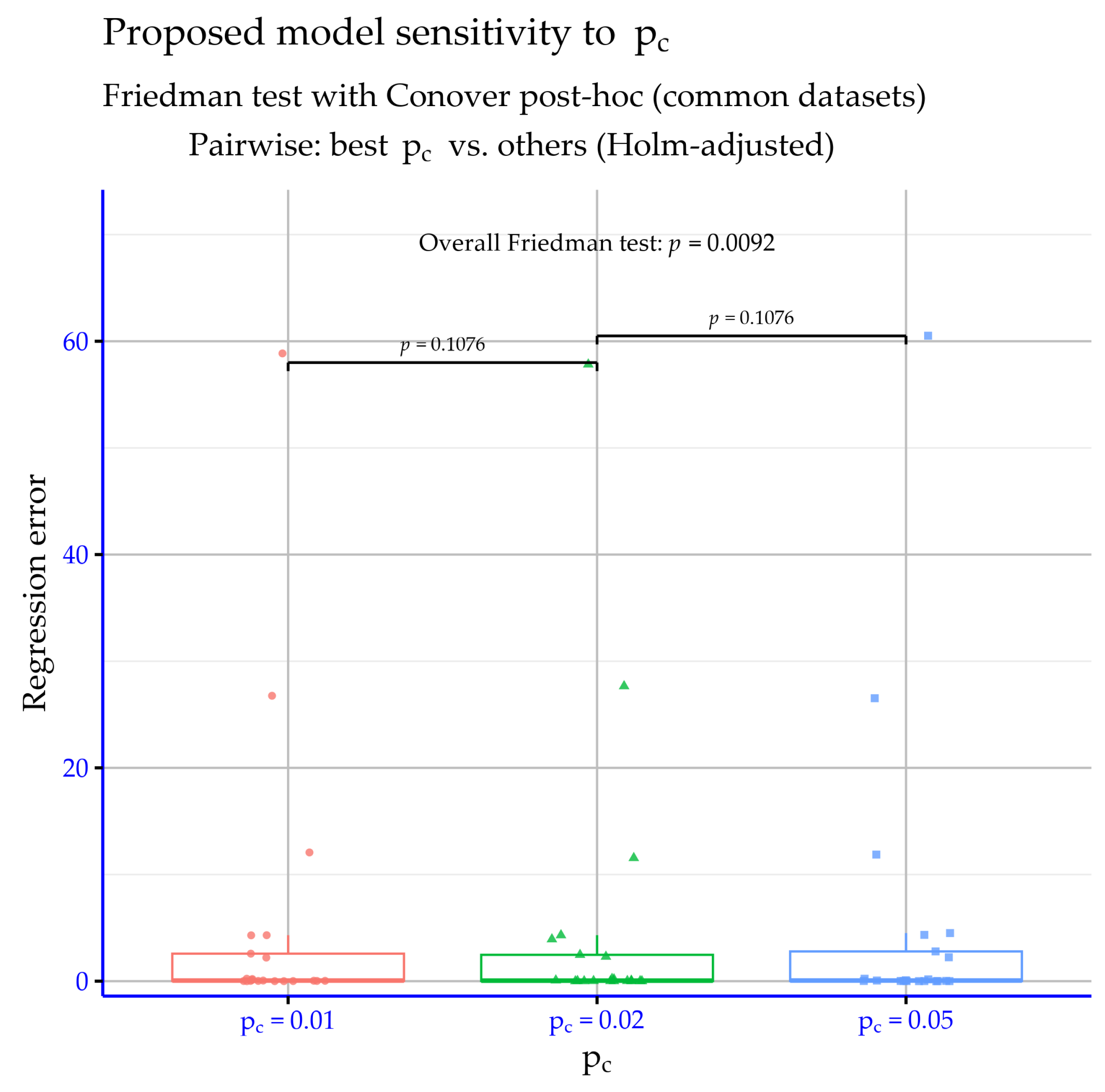 parameter does not produce statistically significant differences on the regression datasets. The overall Friedman test reports
