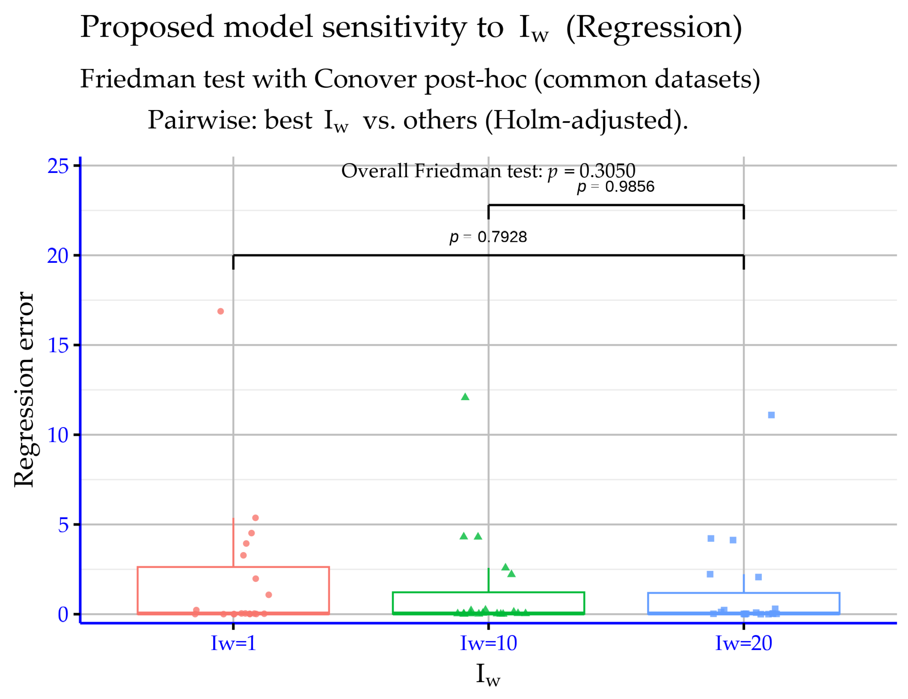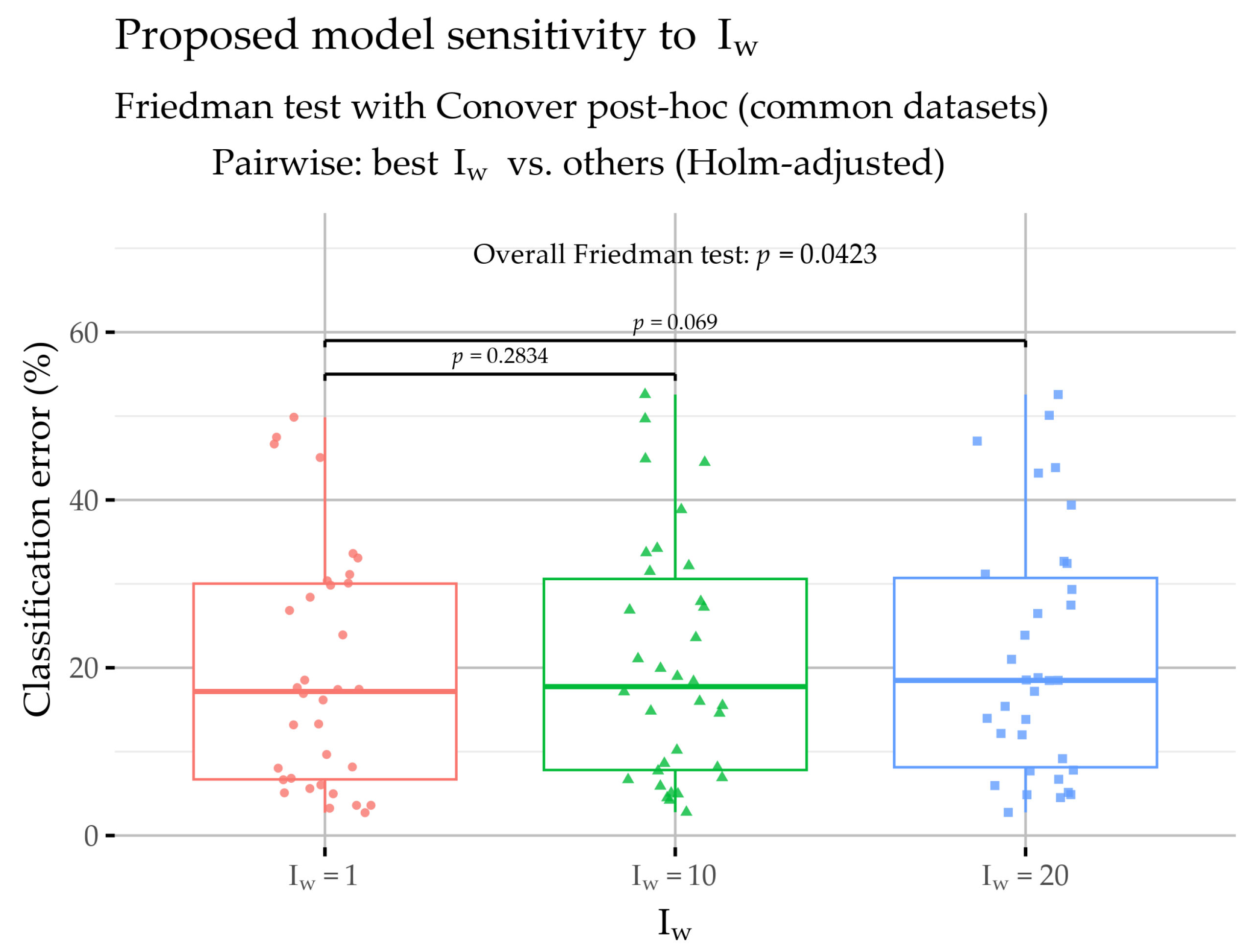 p = 0.069 (also not significant, but close to 0.05). This indicates that differences are modest and distributed across settings rather than producing a clear, strongly significant pairwise contrast. Practically, Iw behaves as a secondary tuning parameter with limited impact, where an overall difference is detectable but not pronounced in simple post hoc tests. Hence, selecting