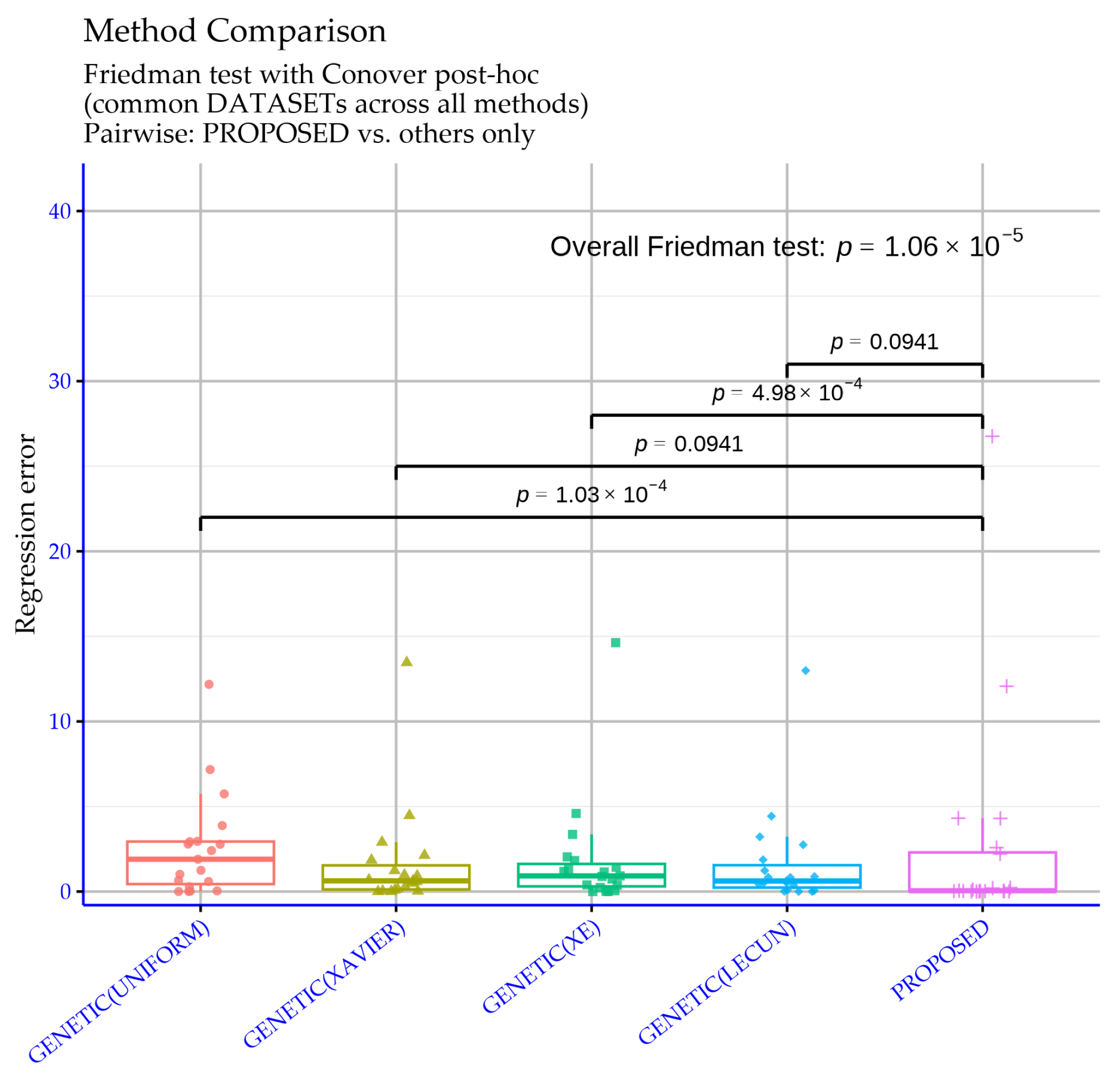 , which strongly rejects the hypothesis that all methods behave equivalently across the regression datasets. Therefore, at the suite level, the genetic initialization choices and the proposed approach lead to performance differences that are unlikely to be explained by random variation.