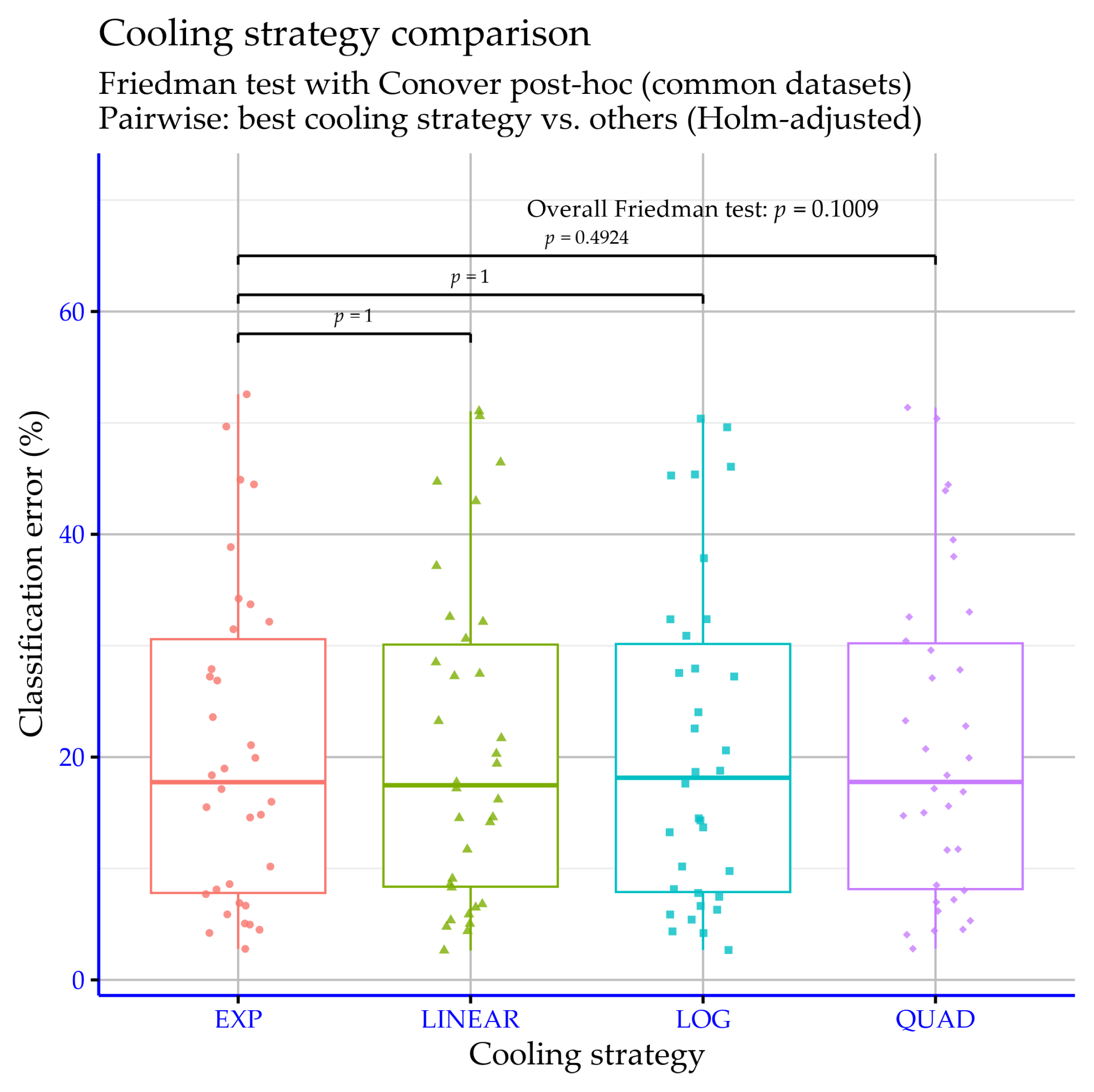 p-values do not support statistically significant differences among the four cooling schedules.
