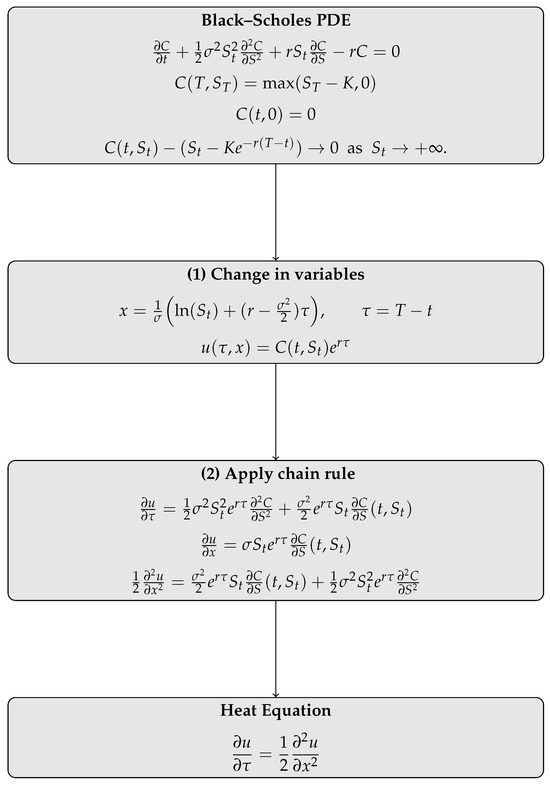 To facilitate comprehension and to make the transformation from the Black-Scholes PDE to the heat equation as transparent as possible, we present below Figure 1: a schematic diagram that illustrates the correspondence step by step. This visual representation is intended to guide the reader through the analytic connection between the two formulations.