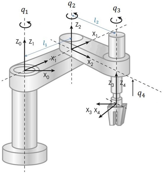 The Selective Compliant Assembly Robot Arm (SCARA) is a rigid-link system with degrees of freedom (dof). According to Figure 3, each joint is represented by generalized coordinated , . The SCARA robot is modeled by nonlinear ordinary differential equations through Euler–Lagrange formalism [29], which is expressed in matrix notation as follows: