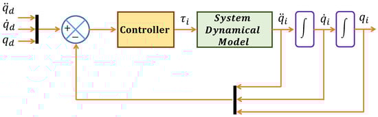 Modern control theory requires a dynamical model of the system to develop a control law, and diverse control strategies, including backstepping, sliding modes, adaptive, robust, and state feedback, have been broadly applied in robotics. For trajectory tracking, a computed-torque control approach based on the Lyapunov method is implemented in this work, as in [29,30,31]. The controller is given by
