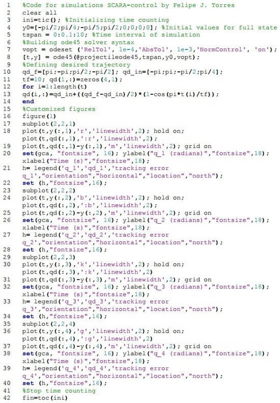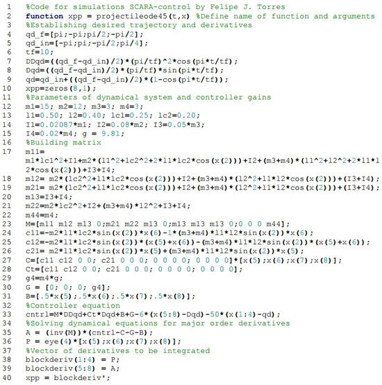 The numerical simulation code has been divided into two files, projectileode45.m and SCARA_inicio_ode45.m, following the steps listed below. The complete code is shown in Figure 5 and Figure 6.