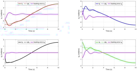 All of the numerical simulations were run within a time span of seconds. Taking the benchmark for numerical simulation analysis, the performance of tracking control can be analyzed using the plot shown in Figure 8, where the dotted lines are used for the desired trajectory, the solid lines are used for trajectory tracking, and the magenta line is used for tracking error. The controller causes the robotic manipulator to follow the desired trajectory in joint space and the error tends to zero as time goes to infinity.