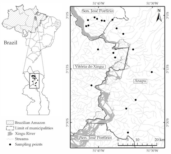 The study was carried out by scanning in 19 streams in the region of Volta Grande do Xingu, in the municipalities of Anapu, Senador José Porfírio and Vitória do Xingu, in the southwest of the state of Pará, Brazil (Figure 1, Table 1). These streams, according to Strahler’s classification [34], are considered small because they are classified as 1st to 3rd order streams (Figure 2). According to the Köppen–Geiger classification, the predominant climate in the region is Am, a tropical monsoon climate, with dry seasons usually lasting from June to November, and rainy seasons from December to May [35]. The average annual temperature in the region is 26.5 °C; the average annual rainfall is close to 2044 mm/year, and the average number of hours of sunshine per year is approximately 2453.73 h/year. In September of 2019, the monthly average number of hours of sunshine was 249 h/month (Climatedata.org, accessed on 17 May 2021) [36].