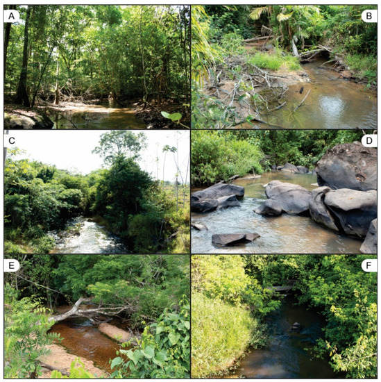 Streams sampled in Volta Grande do Xingu, Pará, Brazil (in 2019): (A) P9; (B) P15; (C) P20; (D) P19; (E) P17; and (F) P18.