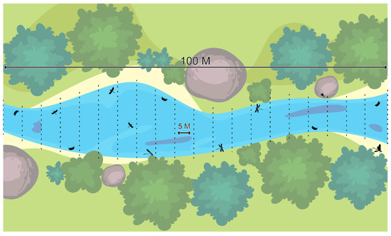 The collections were carried out in September 2019, corresponding to the dry season at the site, due to the logistics of accessing the sites. A 100-m transect was delimited in each stream, and each transect was subdivided into 20 segments of 5-m each (Figure 3). The collection was carried out using the methodology of scanning in fixed areas, with the aid of an entomological net [37,38].