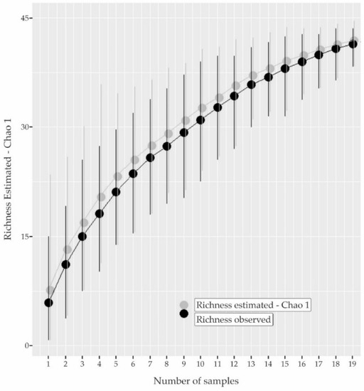 To measure the sampling effort and the number of species collected, the non-parametric Chao 1 estimator was used. This estimator is used for abundance data, and it gives weight for rare species [69]. The accumulation curve of species was generated from the estimator. Chao 1 and the species accumulation curve were calculated using the R software [70] using the vegan package [71].