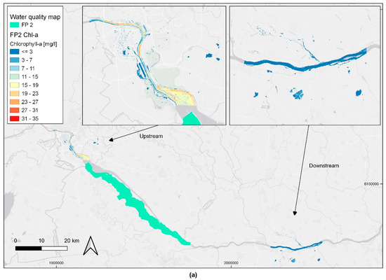 Water quality maps for Chlorophyll-a expressed in mg/L for the three areas that correspond to (a) floodplain 2 (S2 image acquired on: 13 April 2016); (b) floodplains 6 and 7 (S2 image acquired on: 28 February 2017); (c) floodplain 8 (S2 image acquired on: upstream on 26 May 2017 and downstream on 15 May 2017). Basemap: ESRI Gray. EPSG: 3857.