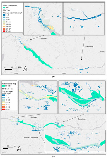 Water quality maps for total suspended matter (TSM) expressed in mg/L for the three areas that correspond to (a) floodplain 2 (S2 image acquired on: 13 April 2016); (b) floodplains 6 and 7 (S2 image acquired on: 28 February 2017); (c) floodplain 8 (S2 image acquired on: upstream on 26 April 2017 and downstream on 15 May 2017). Basemap: ESRI Gray. EPSG: 3857.