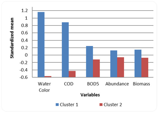 The plot of the standardized means for each cluster of Cl_2O (Figure 1) shows that the two resulting clusters clearly differ in all five analyzed variables. The first cluster was characterized by higher mean values of the variables.