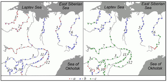 Observations classified according to the Cl_2O gradation (left panel) and according to the Cl_3P gradation (right panel) (a—cluster 1, red; b—cluster 2, blue; c—cluster 3, green; rivers are marked with numbers: 1—Anabar, 2—Olenyok, 3—Lena, 4—Yana, 5—Indigirka, 6—Kolyma, 7—Vilyuy, 8—Vitim, 9—Chara, 10—Olyokma, 11—Amga, 12—Aldan).