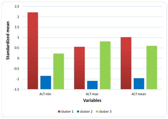 In addition, observations were clustered according to indicators from the group “Characteristics of the seasonally thawed permafrost layer” (hereinafter, gradation Cl_3P “properties of permafrost”). According to the ranked values of the F-criterion, the greatest difference between the clusters was achieved in terms of the minimum and maximum ALT (Table 4).