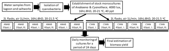 Both cyanobacteria were batch-cultured using 2 L glass conical Erlenmeyer flasks in 2 replicates for each combination of salinity and light intensity (Figure 1C). Water of three salinities, 20, 40 and 60 ppt, and two light intensities of 2000 and 8000 lux from 20 watt 1600 lm LED lamps, measured at the middle of the outer surface of the vessel (Lux meter BIOBLOCK LX-101), were combined to create 6 treatments (3 salinities × 2 light intensities). Temperature was maintained at 20–21.5 °C by a 18,000 BTU air conditioner. A 16 hL:8 hD light duration was maintained by an electric timer controller. The water used to prepare the various salinities originated from the nearby seacoast. It was first autoclaved at 121 °C for 20 min in order to eliminate all organisms and then adjusted to 20 ppt by sterilized distilled water or to 60 ppt by the dilution of the proper quantity of sterilized artificial salt (Instant Ocean®, Blacksburg, Virginia, USA). After the filling of the culture vessels with the proper amount of sterilized water (1900 mL), 100 mL of stock mature culture (in exponential phase) of the respective species were added. Then, 1 mL/L of each of Walne’s final nutrient solutions of metals, micronutrients, and vitamins were finally added. In Figure 2, the whole procedure is depicted schematized as a flow chart.