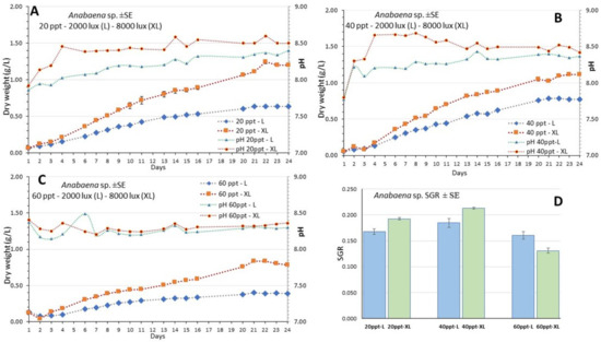 The growth curve (g dry weight/L) of the culture of Anabaena sp. at the salinities of (A) 20 ppt, (B) 40 ppt and (C) 60 ppt and at each light intensity (L: 2000 lux; XL: 8000 lux). Also depicted are the pH daily values in each condition. Values are means of 3 measurements ± standard error (SE). In (D) there the values of Specific Growth Rate (SGR) ± SE are depicted for the time interval of the 4th to 9th day for each treatment.