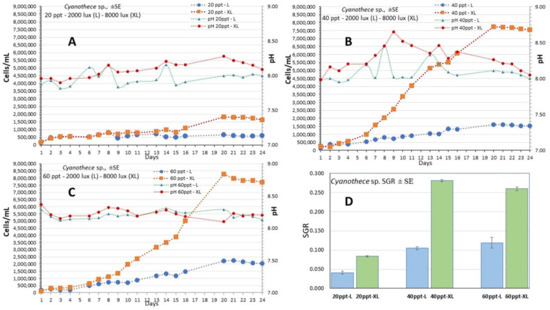 The growth curve (cells/mL) of the culture of Cyanothece sp. at the salinities of (A) 20 ppt, (B) 40 ppt and (C) 60 ppt and at each light intensity (L: 2000 lux; XL: 8000 lux). Also depicted are the pH daily values in each condition. Values are means of 3 measurements ± standard error (SE). In (D) the values of Specific Growth Rate (SGR) ± SE are depicted for the time interval of the 4th to 11th day for each treatment.