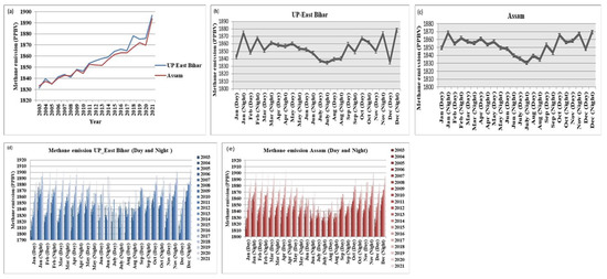 (a) Yearly methane emission of UP East, Bihar, and Assam over 19 years, (b) monthly methane emission of UP East and Bihar over 19 years, (c) monthly methane emission of Assam over 18 years, (d) monthly and yearly comparative methane emission pattern of UP East and Bihar over 19 years, and (e) monthly and yearly comparative methane emission pattern of Assam over 19 years.