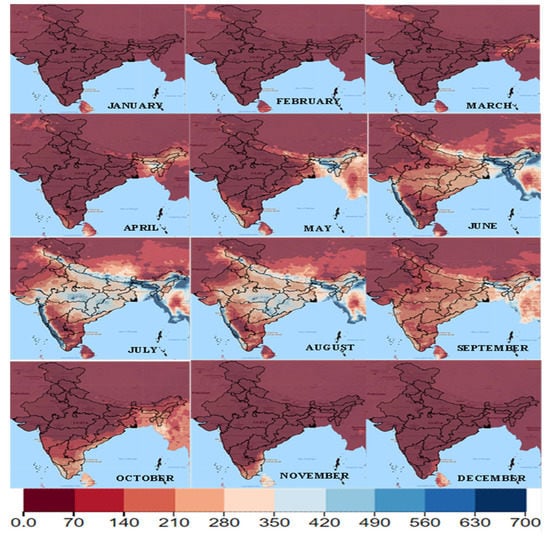 Figure 5 shows 41 years of vegetation data of India, including UP East, Bihar and Assam, and also shows the lowest vegetation from April to July and the highest from August to October. The vegetation is dependent on the raining pattern. As we discussed earlier, the months of March and November show average rainfall, the lowest rainfall is observed in April and May, and the highest is observed from June to September. During the lowest rainfall from April to May, it shows less vegetation, and from June to September, higher rainfall increases the rate of vegetation, mainly from August to October (Figure 5). Similarly, increasing the rate of vegetation from August to October supports an increment in the methane emission rate, which started to increase from September to April in UP East, Bihar, and Assam (Figure 3d,e). Higher growth of rice plants and wetlands ecosystem plants was identified after August and many studies support our finding that the higher rate of vegetation after the monsoon increased the rate of methane emission (Figure 3d,e and Figure 5) [66,67,68].