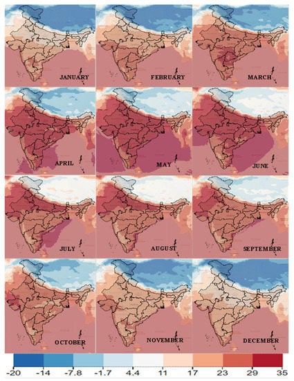 Satellite data of the monthly temperature pattern of India over 41 years.