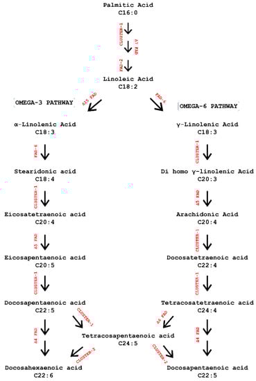 An overview of LC-PUFA biosynthetic pathway in microalgal cell is illustrated in Figure 1. The first set of enzymes elongase (ELO6, 2, 4), 3-oxoacyl-CoA reductase (KCR), 3-hydroxyacyl-CoA dehydratase (HACD), enoyl-CoA reductase (ECR), referred to as cluster 1 (Figure 1), were involved in de novo fatty acid synthesis in chloroplast where palmitic acid (C16:0) is transferred from chloroplast to endoplasmic reticulum as free fatty acid to further undergo elongations and desaturations. In the first step, C16:0 undergoes a stepwise addition of carbon atoms via enzymes of cluster 1, resulting in the synthesis of linoleic acid (C18:2ω-6, LA) [46]. In addition, C18:2ω-6, LA via Δ6 desaturation enters the omega-3 pathway, forming alpha-linolenic acid (C18:3ω-3, ALA). Further linoleic acid can be diverted towards omega-6 pathway by forming precursor gamma-linolenic acid (C18:3ω-g, GLA). Additionally, C18:3ω-3, ALA via Δ6 desaturation and cluster 1 reactions forms C20:5ω-3, EPA, which is further converted to C22:5ω-3, DPA-3 and C22:6ω-3, DHA via Δ5 elongase and Δ4 desaturased enzymes [47]. Degradation of synthesized LC-PUFAs further undergoes β-oxidation reactions (cluster 2) to reduce carbon chain length and interacts with long-chain acyl-CoA synthetases (ACS). These crucial enzymes are responsible for the esterification and activation of free FAs to CoA to form acyl-CoAs. Further, the LC-PUFAs undergo stepwise reactions involved in β-oxidation. Enzymes such as acyl-CoA oxidase (ACDase), enoyl-CoA hydratase (ECoAH), and acetyl-CoA acyltransferase (ACAT) are responsible for retro conversion of these LC-PUFAs. They utilize tetracosahexaenoic acid (C24:6) and tetracosapentaenoic acid (C24:5) as substrates for the synthesis of docosahexaenoic acid (22:6ω-3, DHA) and docosapentaenoic acid (DPA C22:5), respectively.