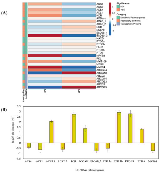 The raw reads of genes, regulatory elements, and transporter proteins related to LC-PUFAs were selected from the publicly available transcriptome datasets (NCBI Accession number SRP040703) for analyzing their regulation under specific conditions. P. tricornutum was selected for the transcriptome analysis based on the previous literature [20,48,49,50], showing a high amount of LC-PUFA content, especially EPA content [51]. Our analysis reveals that genes such as 3-oxoacyl-CoA reductase (KCR), long chain fatty acyl-CoA synthetase (LC-FACS (ACL1, ACS4)), and elongase (ELO6b) are significantly downregulated in the ND condition (Figure 2A). Further, it was observed that the expression of two genes involved in β-oxidation, enoyl-CoA hydratase (ECoAH) and acetyl-CoA acyltransferase (ACAT1), were 1.59 and 1.57 log2-fold higher, respectively (Figure 2A). LC-PUFA biosynthesis in P. tricornutum in the ND conditions reported remodelling of membrane lipids [52].