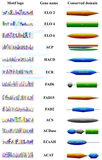 Protein sequence characterization involves recognition of the motif and domain regions present as compressed structures within the cells. Since motifs and domains are highly conserved in nature compared to other protein parts, they tend to evolve with the least minimal changes. Among the LC-PUFA biosynthesis pathway, around 13 motif structures were identified (Figure 4) by MEME tool [40], which represents a high degree of conservation among the studied microalgal strains. The height of each stack represents the positional conservation of sequences and the height of symbols within each stack reflects the relative frequency of the corresponding amino acid (Figure 4).