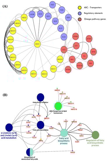 Further analysis was carried out using the Cytoscape plugin ClueGO [43] to visualize the GO terms and pathways to identify a complex network (Figure 5B). The analysis shows connection between the β-oxidation pathway, long chain polyunsaturated fatty acid (omega-3 fatty acids) biosynthesis, some important members of ABC transporters (involved in lipid homeostasis) and regulatory elements based on GO and pathway enrichment. Our interaction analysis demonstrates that ABCD1 connects the fatty acid β-oxidation process, the fatty acid biosynthetic process, and α-linolenic acid metabolism. Genes involved in unsaturated fatty acid biosynthesis are the ones which are present in both metabolism as well as biosynthesis. This particularly highlights the fact that LC-PUFA biosynthesis is not just a crosstalk of elongases and desaturases, but multiple other potential targets are also involved for their regulation and synthesis in these microalgal cells.