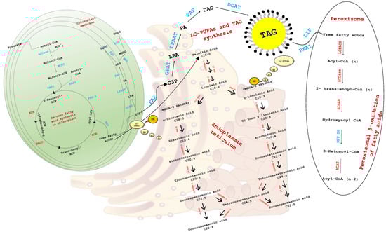 Schematic representation of LC-PUFAs biosynthesis in microalgal cells. Genes marked in red are the ones involved in elongation, desaturation, and β-oxidation of omega fatty acids in different cellular locations. Abbreviations: elongase 6, 2, 4 (ELO); 3-oxoacyl-CoA reductase (KCR); 3-hydroxyacyl-CoA-dehydratase (HACD); enoyl-CoA reductase (ECR); fatty acid desaturases (FAD); Acyl coA synthetase (ACS/LCFACS); acyl-coenzyme A oxidase 1 (ACDase); enoyl CoA hydratase 2 (ECoAH); acetyl-CoA acyltransferase (ACAT).