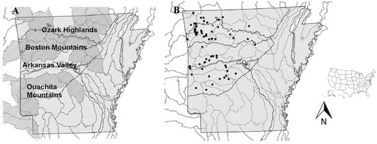 (A) Historic distribution of A. mohri across Omernik Level III ecoregions. The HUC8 units that overlapped with A. mohri presence watersheds from Poulton and Stewart, 1991 are hatched. The HUC8 units in Arkansas that did not have A. mohri presence are outlined. (B) Locations of the 74 reaches sampled in the present study. The northernmost site coordinates are (36.44117572, −94.22998045) southernmost site coordinates are (34.68526175, −94.32049797). Sample reaches fell within the following HUC8 units: Ouachita Headwaters, Upper Saline, Fourche La Fave, Poteau, Petit Jean, Frog-Mulberry, Dardanelle Reservoir, Robert S. Kerr Reservoir, Beaver Reservoir, Bull Shoals Lake, Elk, Little Red, Middle White, Buffalo, Upper Ouachita, Little Missouri, Lower Little, Illinois.